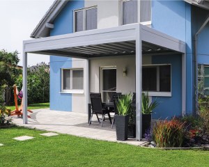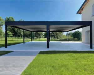 Pergola en aluminium avec toit rétractable pour l'aménagement de terrasses et de jardins. Sur demande, elle est disponible dans la version Arcadia-K, la pergola avec des gouttières intégrées dans la structure.