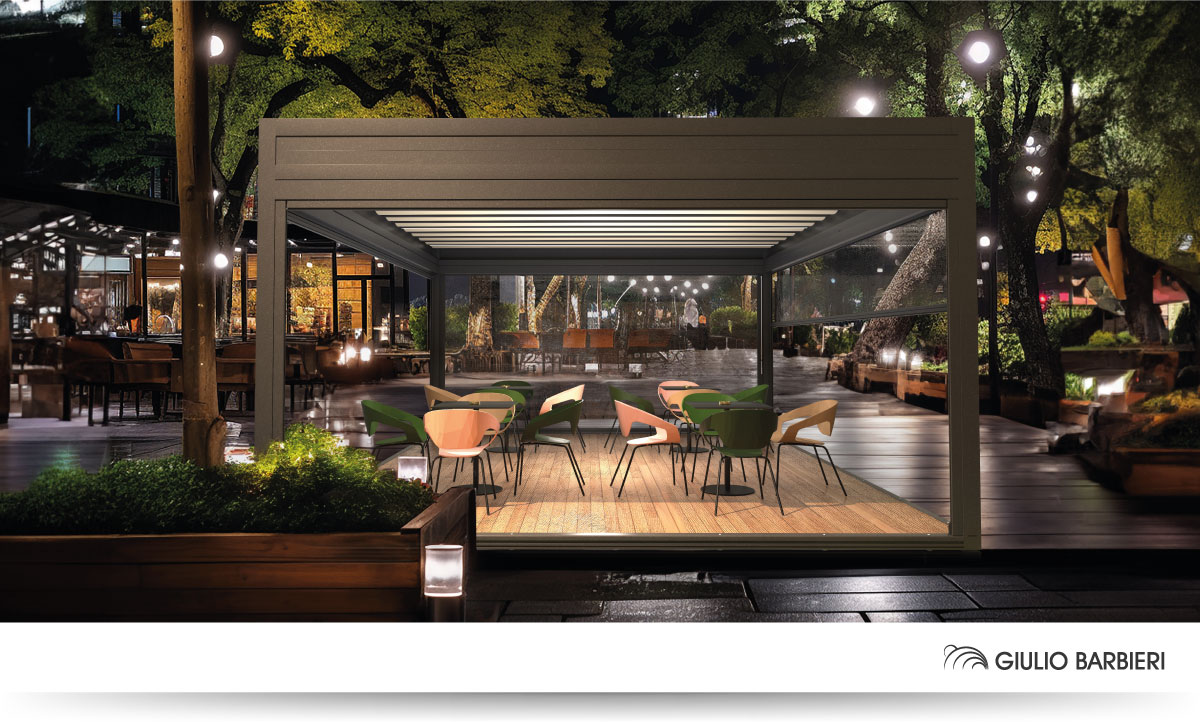 Le produit pergola à toit rétractable Arcadia du fabricant Giulio Barbieri classé dans la catégorie Menuiseries extérieures > Vérandas - bow windows - marquises - pergola > Auvents - marquises - pergola est référencé dans la Matériauthèque digitale Materiaux.archi.