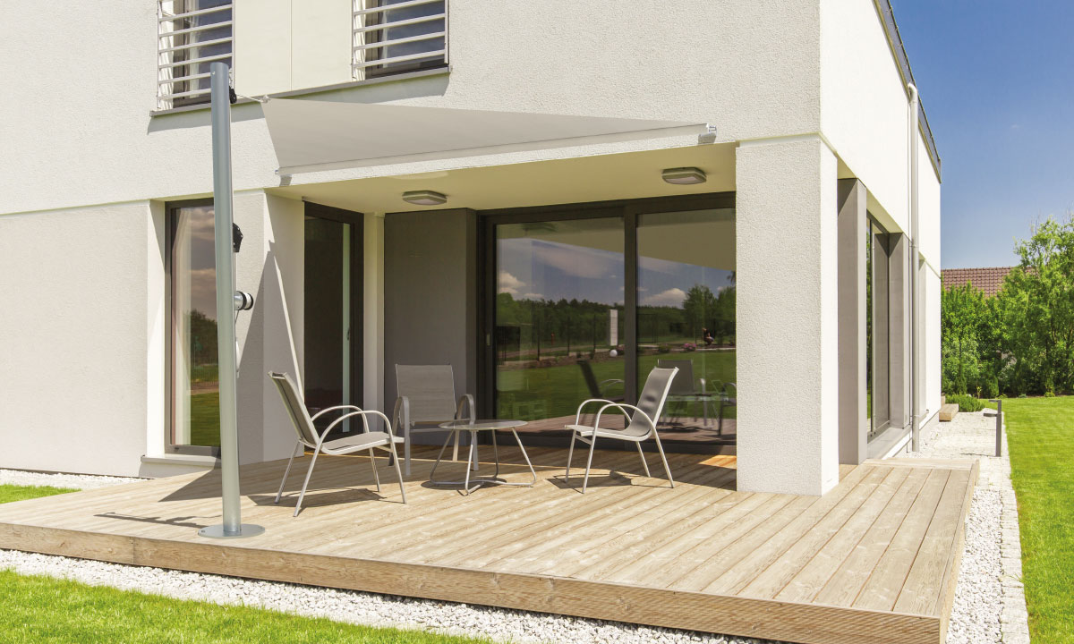 Velart est équipée d'un système d'enroulement assisté par ressort qui facilite l'ouverture et la fermeture manuelle. Le montant peut être ancré au sol même sans nécessiter de fondation, grâce à un élégant lestage fonctionnel réalisé en granulat de pierre blanche.
