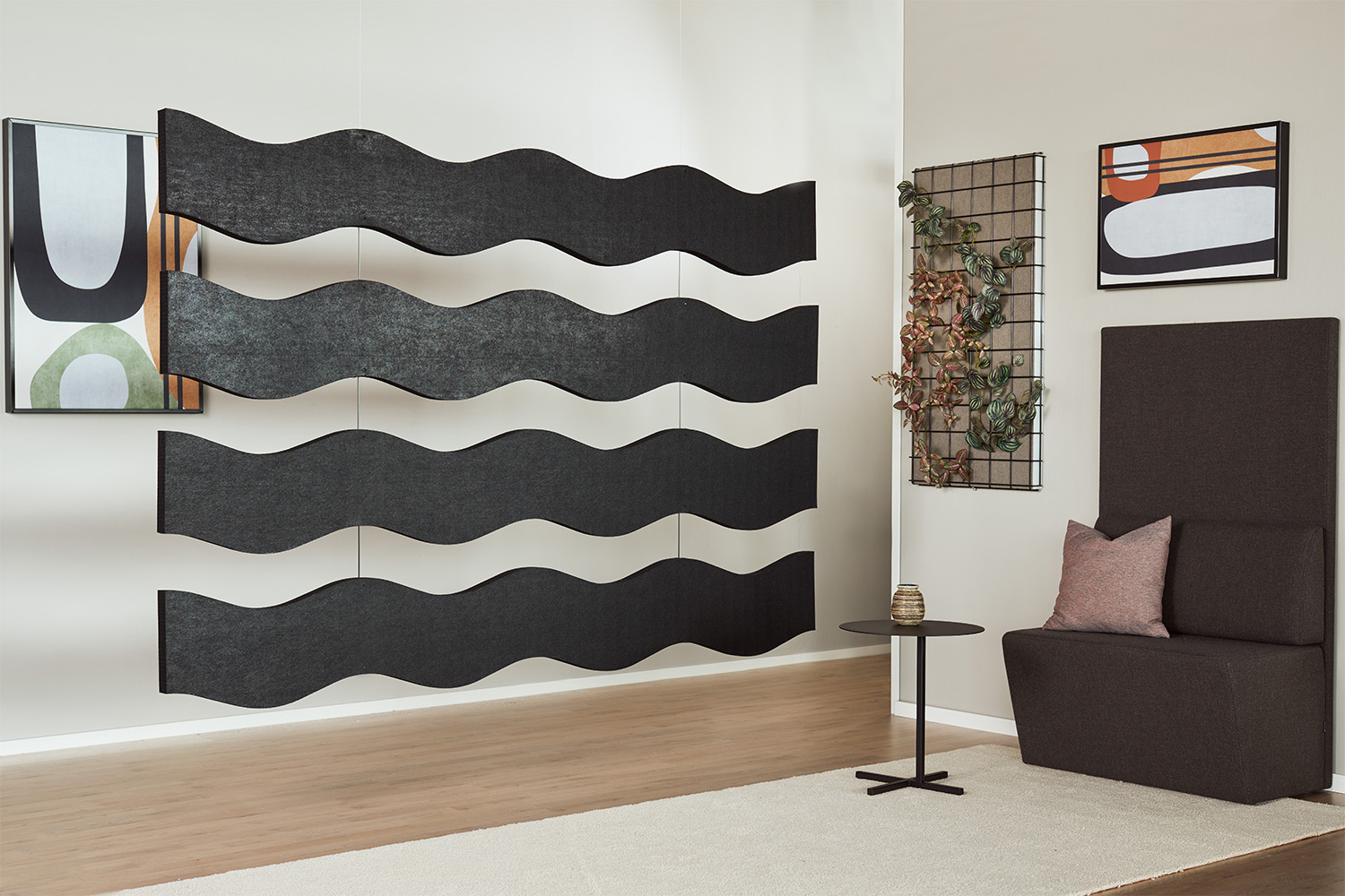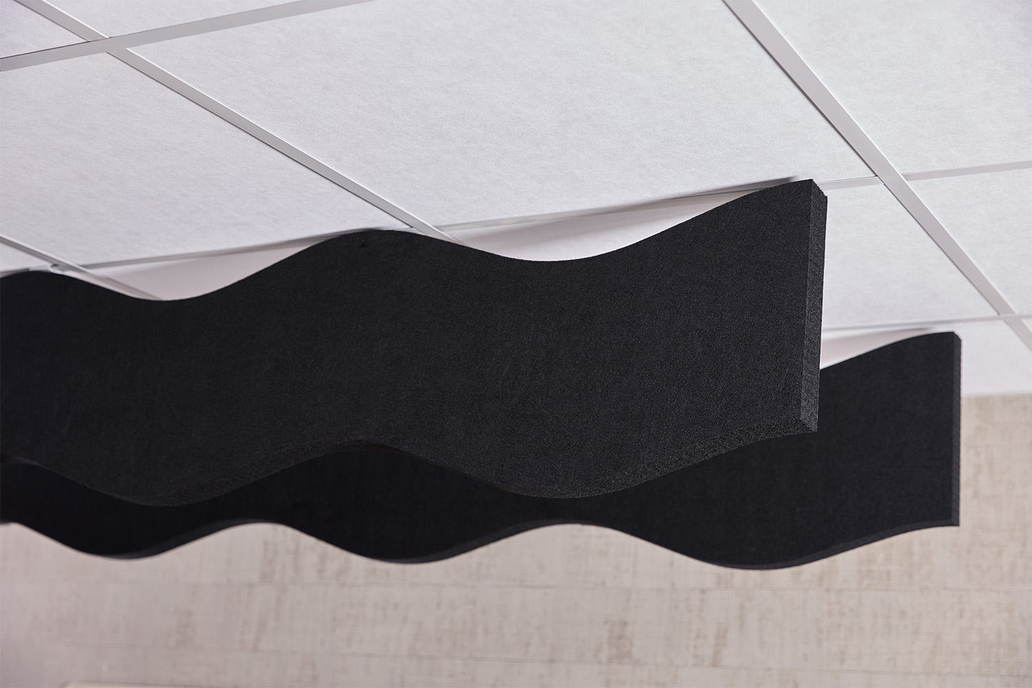 Suspendu au plafond, Pendula Wave se transforme en une cloison efficace qui améliore l'acoustique de la pièce tout en y apportant une touche d'élégance.