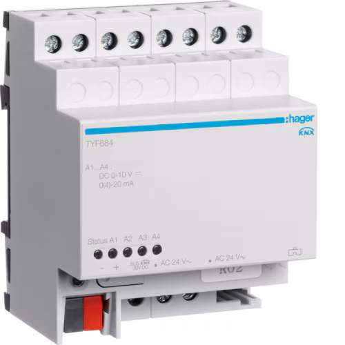 Le produit Dispositif de sortie analogique KNX à 4 gangs du fabricant hager classé dans la catégorie Electricité - Eclairage > Alimentation - distribution - protections > Compteurs électriques et disjoncteurs est référencé dans la Matériauthèque digitale Materiaux.archi.