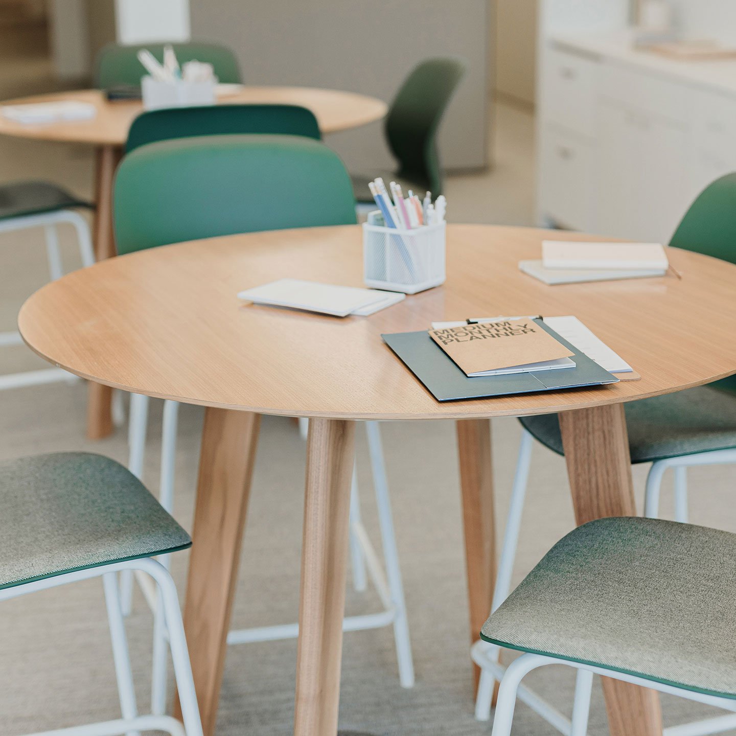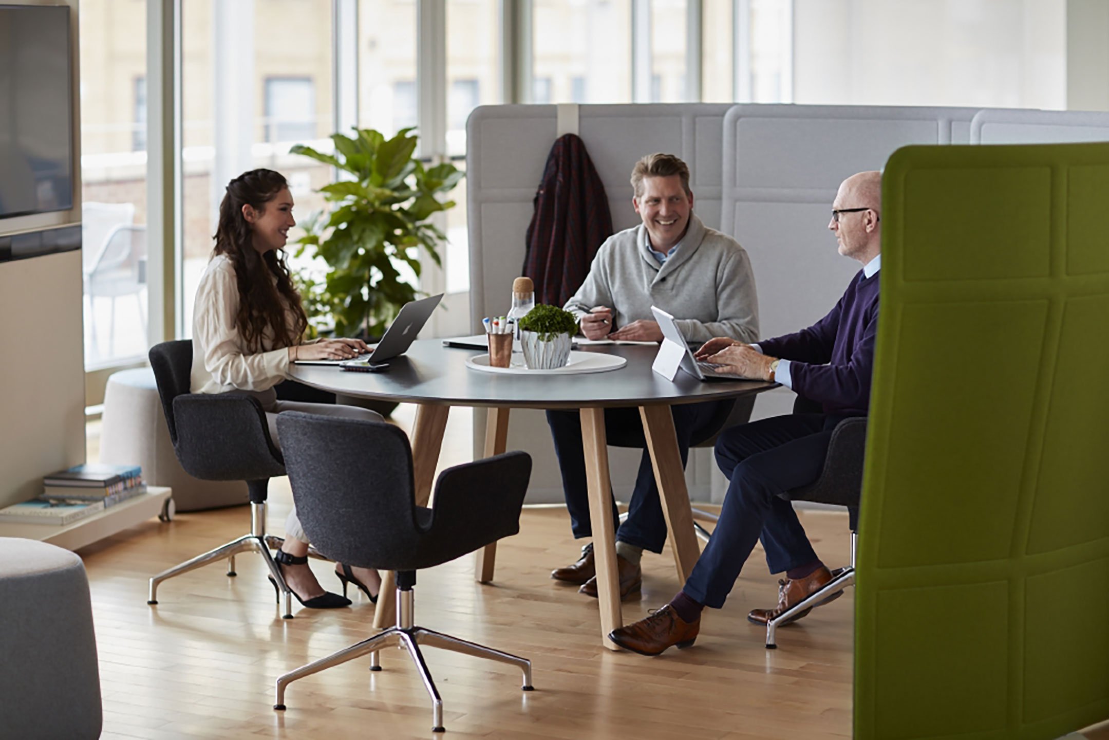 Une table de réunion aux formes, dimensions et hauteurs multiples. Immerse crée un microcosme d'espace collaboratif.