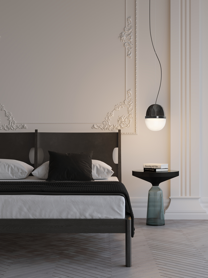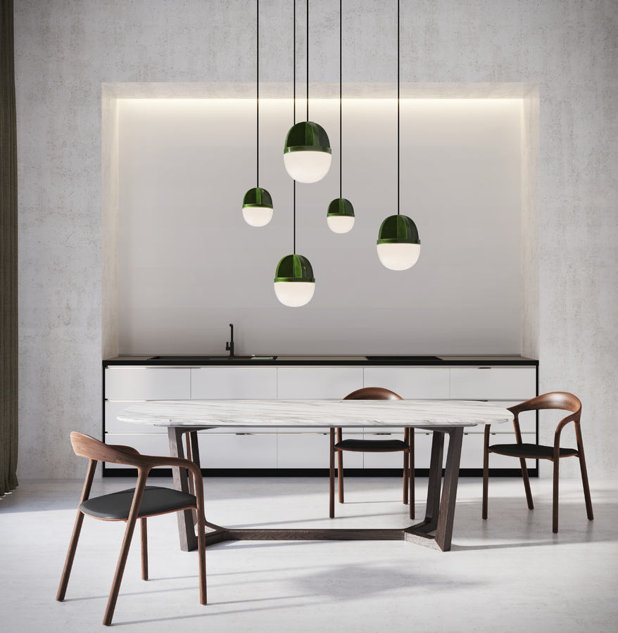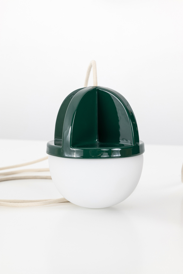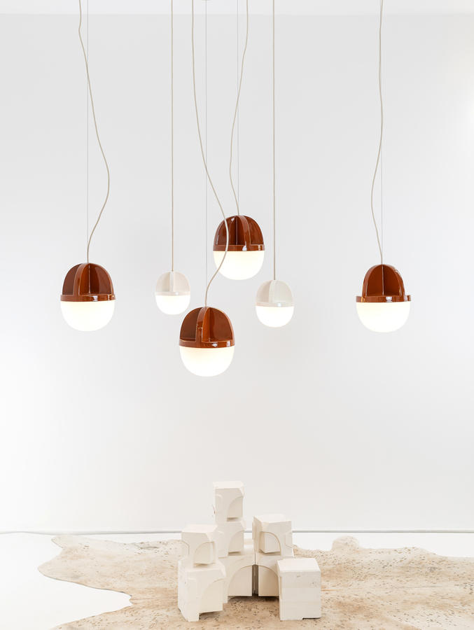 Tout comme le jour et la nuit sont deux entités distinctes, il en va de même pour cette suspension. Le socle adopte une approche assez traditionnelle, diffusant une lumière douce à travers sa demi-ampoule en verre opalin. C’est la partie qui prend vie lorsqu’il y a plus de besoin de lumière. En revanche, la partie supérieure en céramique, avec sa forme de croix caractéristique, exprime toute la force de sa personnalité lorsqu’elle est brossée par la lumière du jour.