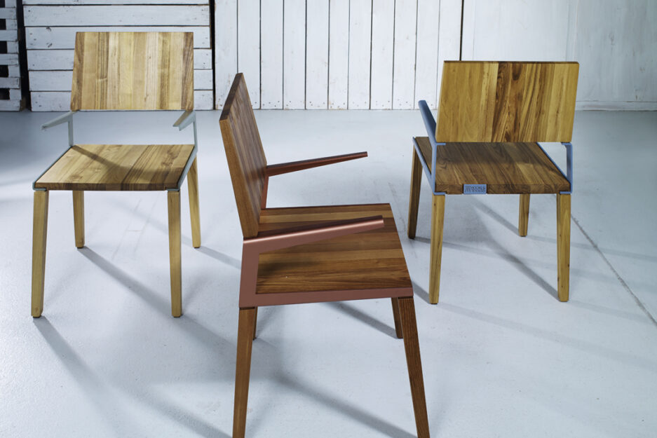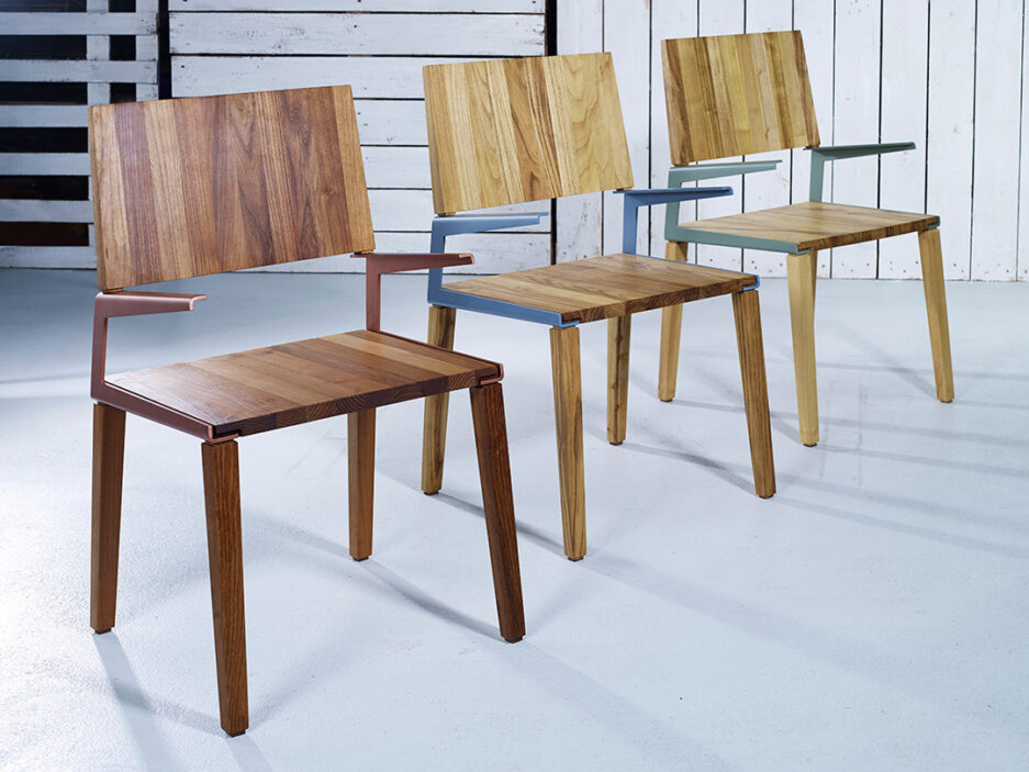 Cette chaise est la combinaison de l’acier et du bois. L’élément dominant est le profilé en acier L caractéristique qui unit le dossier à l’assise, qui peut également servir d’accoudoir. Le profil en acier L réduit, les couleurs pastel, combinés à une surface en bois naturel lisse, renforcent l’impression d’un look sophistiqué et élégant. Une attention particulière est accordée aux détails, à la connexion de deux matériaux différents – l’acier et le bois – qui, grâce au rainurage, permettent à l’air de former une liaison douce. Les types de bois adaptés à cette collection sont le noyer et le chêne « savon ». Le client a la possibilité de choisir le type de bois ainsi que la finition métallique qui peut être peinte selon la carte de tons RAL, bruni, patiné – cuivré ou plastifié mat à grain fin. Le processus de finition du bois comprend des huiles et des cires naturelles.