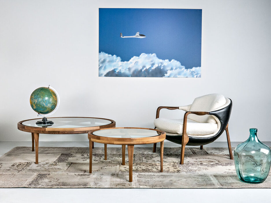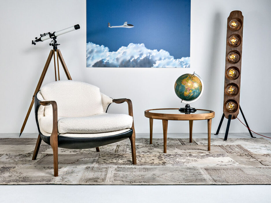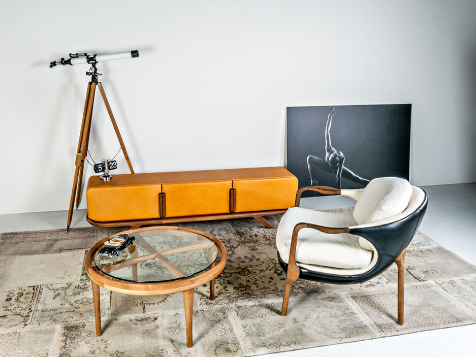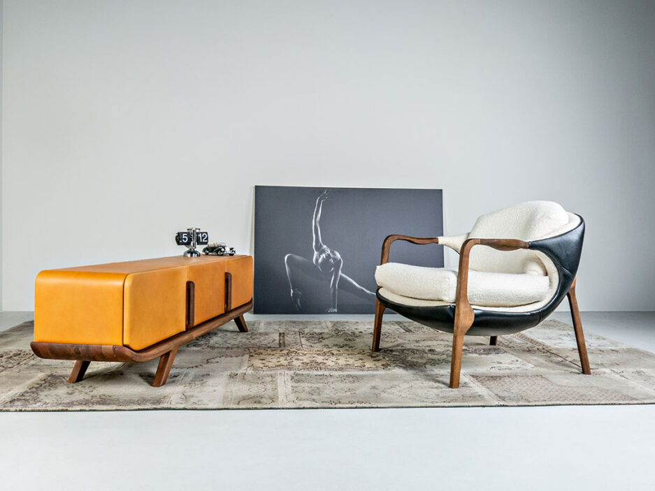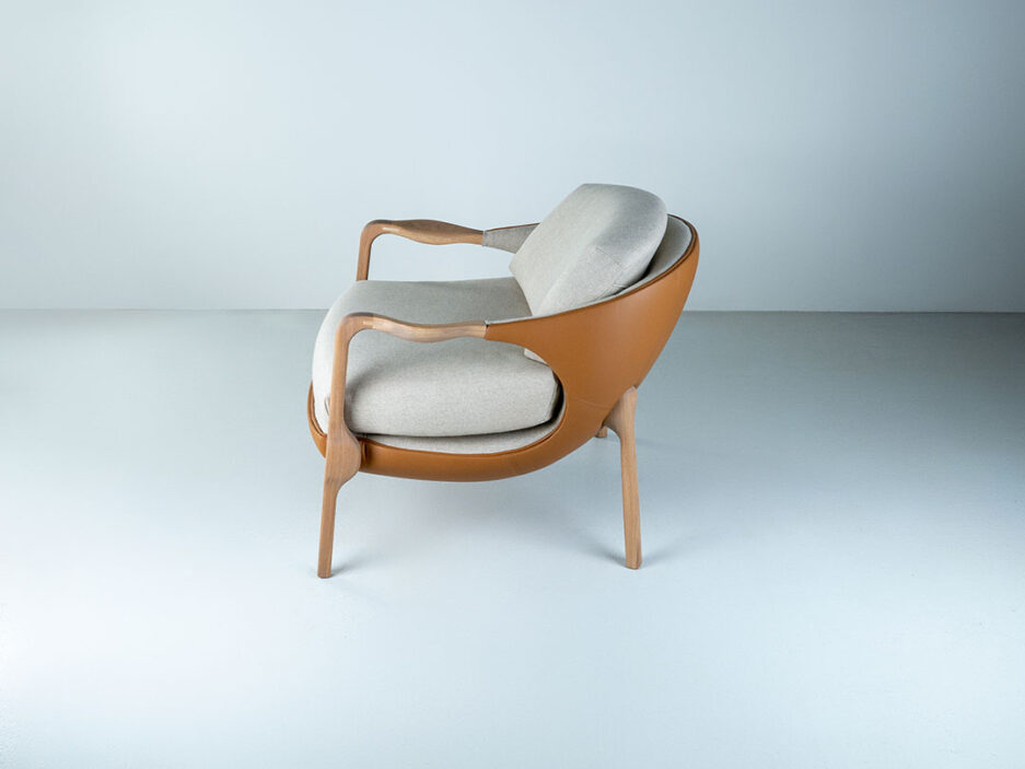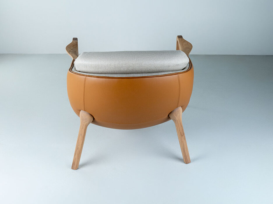 Le fauteuil met l’accent sur les formes tridimensionnelles de l’assise et du dossier sphériques caractéristiques en sous-structure en fibre de verre recouverte de couches d’éponge HR, tapissée de l’extérieur dans le cuir le plus fin avec des coutures décoratives, et à l’intérieur en boucle panachée en matériau naturel. L’impression générale créée par ce fauteuil est un look riche et somptueux qui est encore renforcé par les accoudoirs « musclés » modélisés en 3D en bois massif qui se fondent dans le pied avant, ainsi que par l’aspect organique distinctif des pieds arrière placés radialement également en bois massif.
