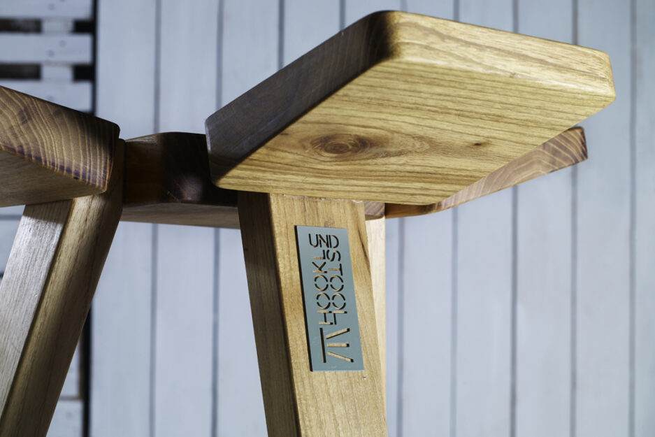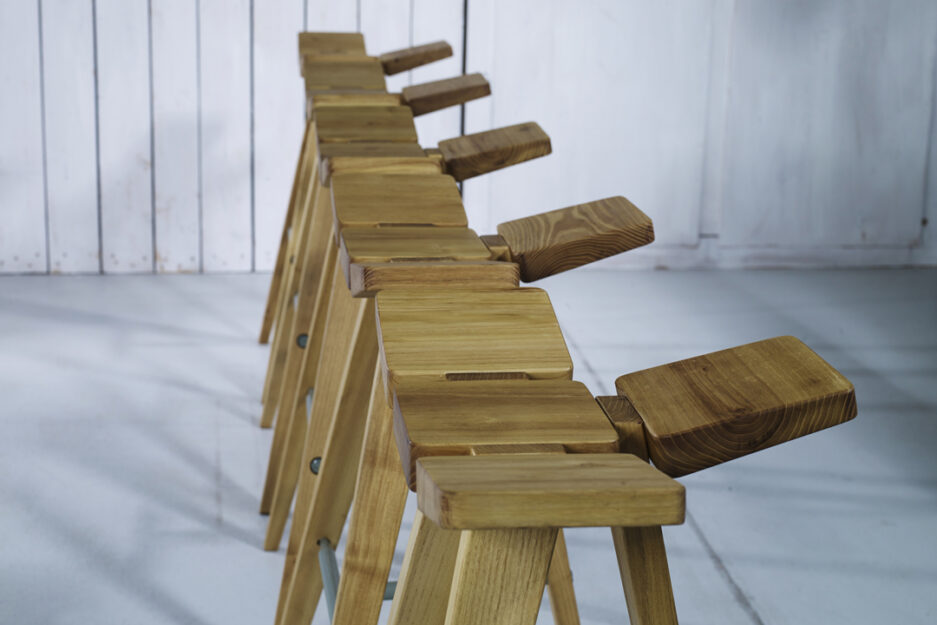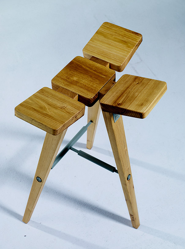 Les éléments de base de ce tabouret sont appliqués à un tabouret de bar d’une manière différente et plus dynamique. L’assise se compose de panneaux qui ressemblent à la forme d’un trèfle à trois feuilles. Les découpes latérales de la surface de l’assise, qui sont légèrement courbées vers le haut, permettent d’obtenir une dynamique supplémentaire. Cela donne l’impression de légèreté de l’ensemble de la pièce.