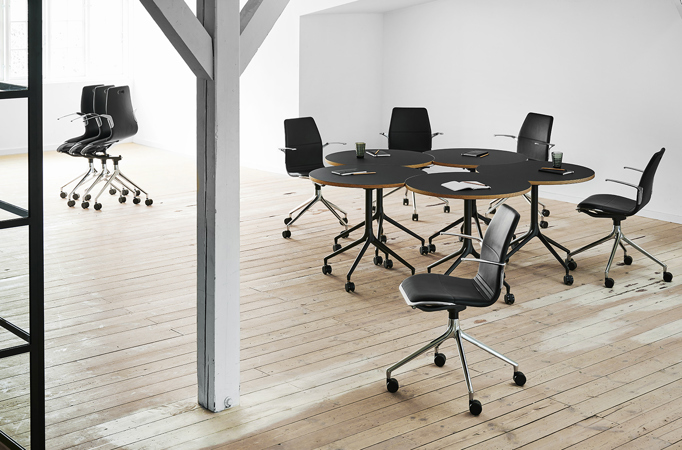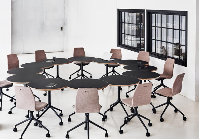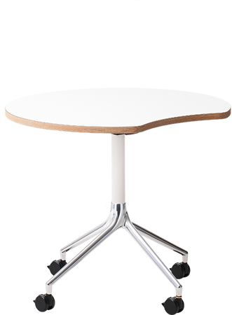 La table est livrée avec des plateaux ronds et carrés, mais se caractérise surtout par le plateau rond avec un évidement concave - appelé plateau rond concave - qui permet aux tables de s'ancrer et d'être reliées entre elles dans un nombre illimité de formations, à partir de petits groupes de trois. aux grands cercles ronds ou à toute autre forme organique imaginaire. La table a une hauteur de café standard et peut être retournée et emboîtée lorsqu'elle n'est pas utilisée.