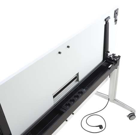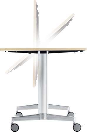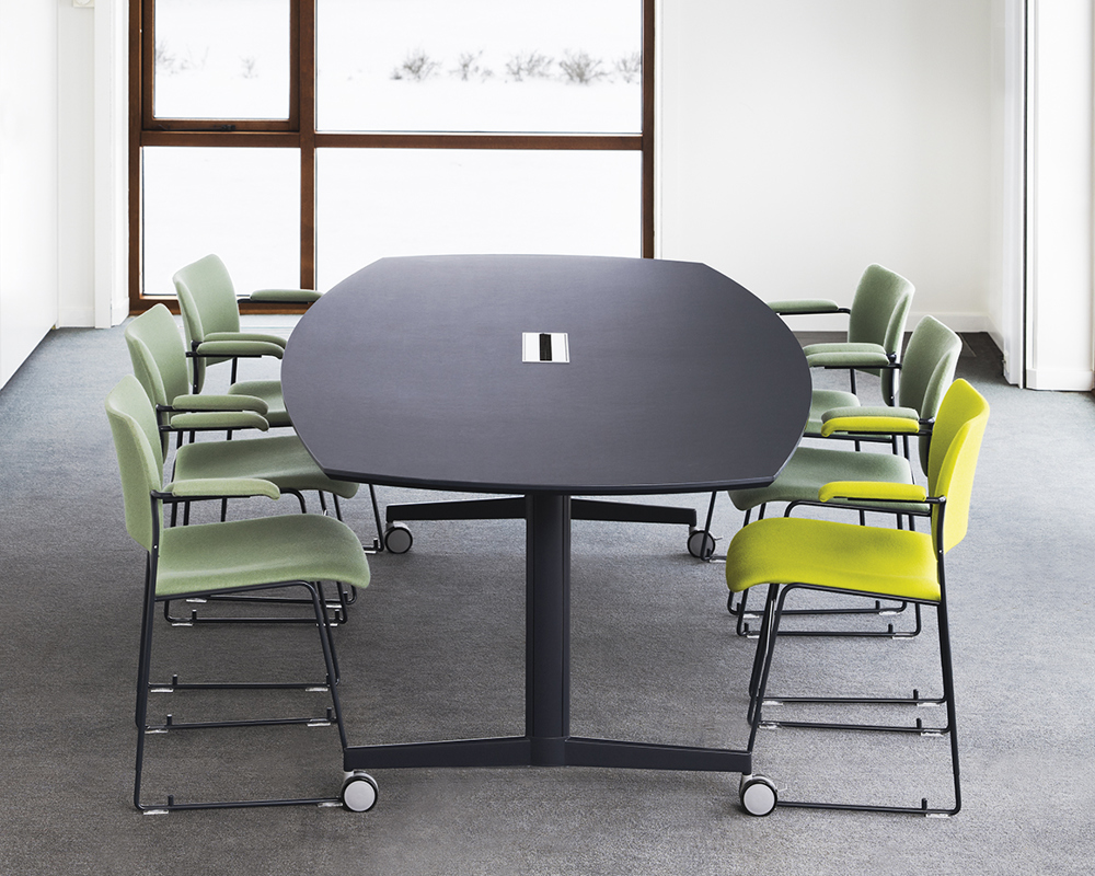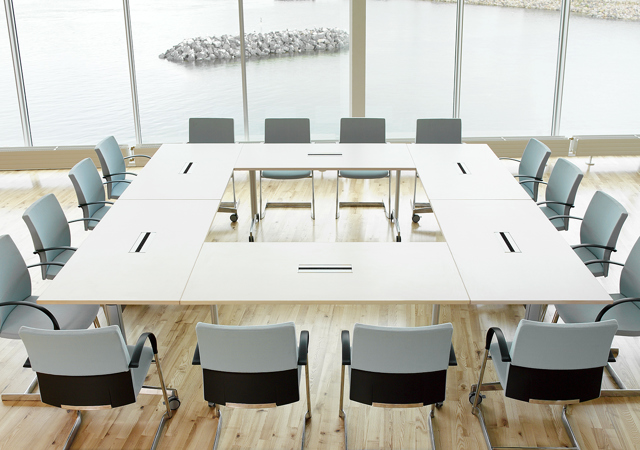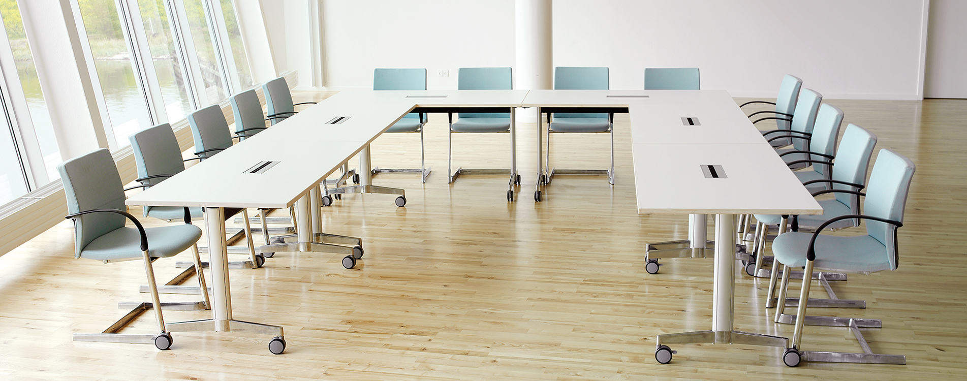 Moveo est un système de table mobile rabattable destiné à la formation, aux réunions et aux conférences avec une solution intégrée pour le câblage dissimulé. Style de jambe en T inversé. Plateaux rectangulaires, demi-ronds ou en V en plusieurs tailles. Les tables peuvent être imbriquées lorsqu'elles ne sont pas utilisées.