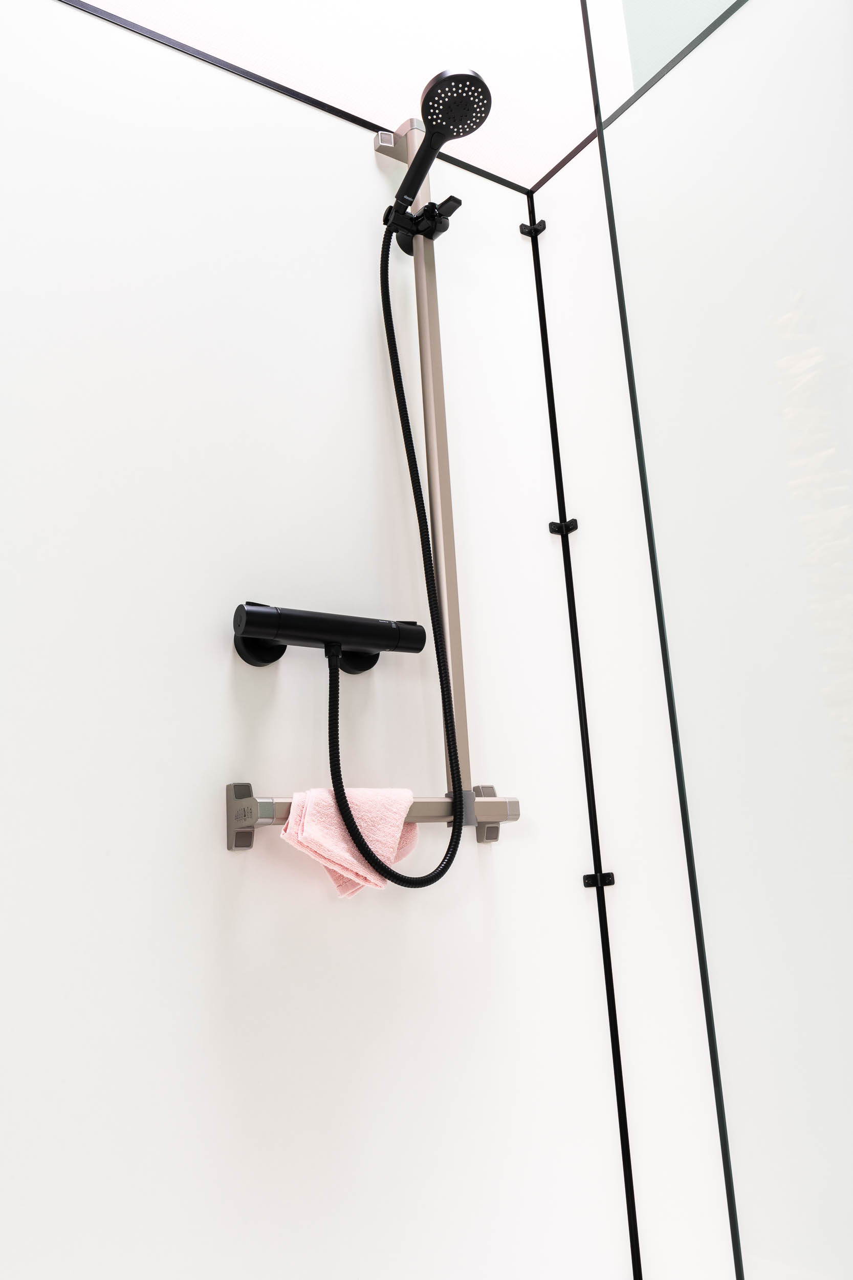 | Matériau(x) | HPL pour les panneaux muraux + Verre de sécurité pour la paroi + résine pour le receveur de douche + aluminium pour les profilés | |