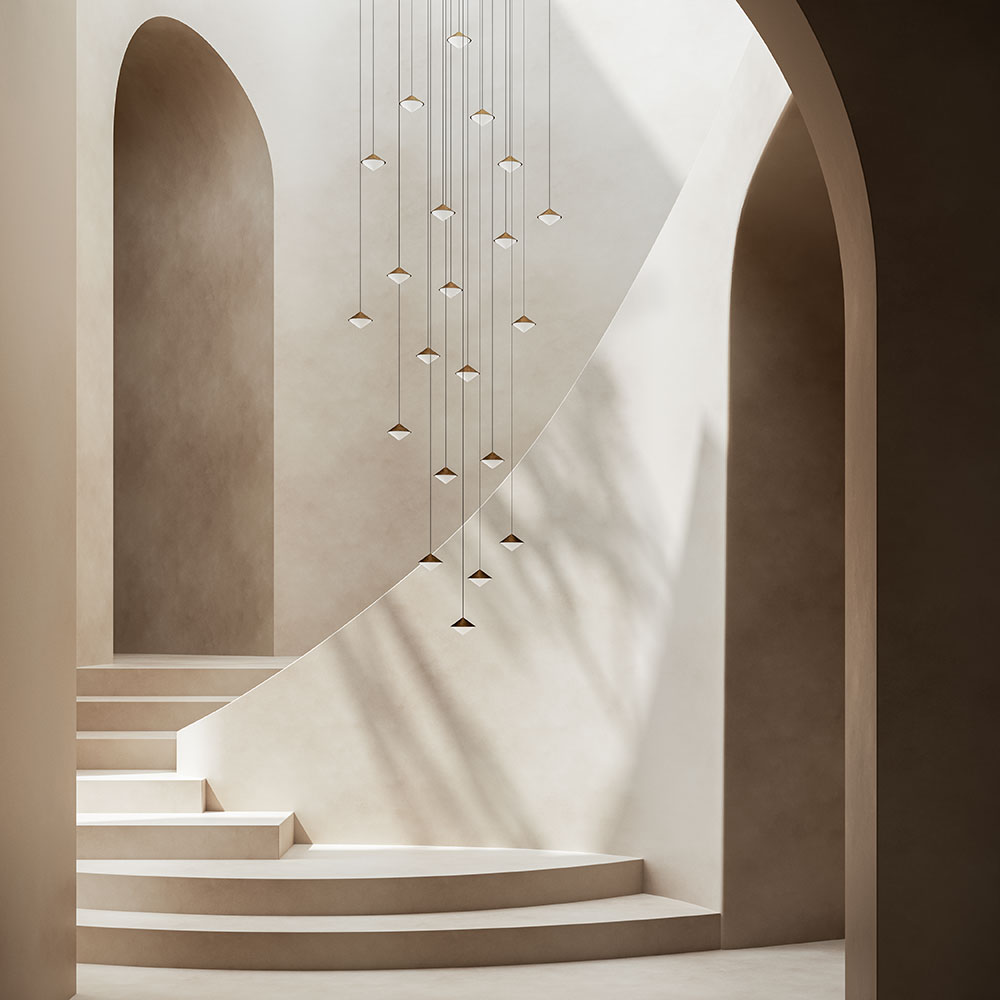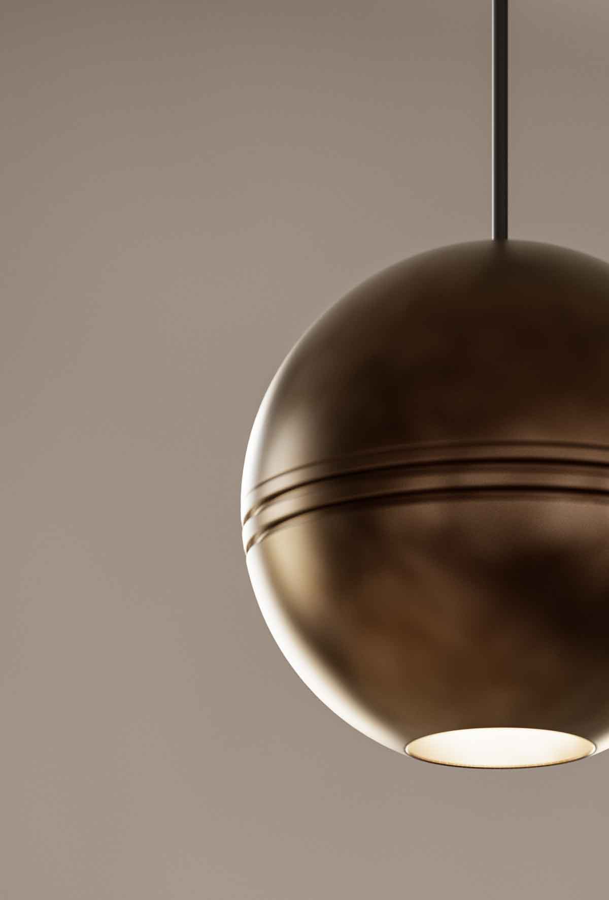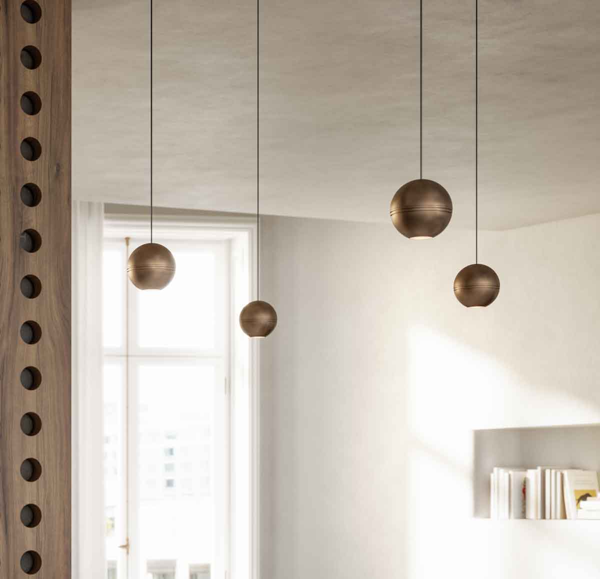 Collection Cluster au design épuré et raffiné. Son nom est une référence aux deux gravures circulaires qui embellissent sa structure sphérique en finition marocaine, lui donnant une touche distinctive et élégante. Les trois différentes longueurs de câble disponibles, combinées aux différents types de rosaces et d’accessoires, en font une collection polyvalente adaptée à la création de compositions lumineuses uniques et évocatrices.