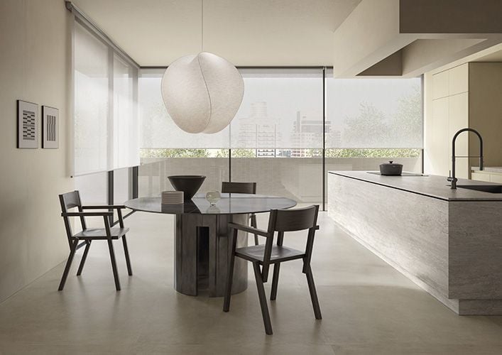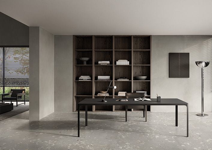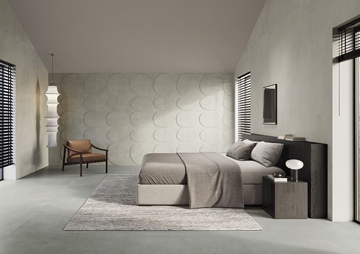 La profondeur des surfaces effet ciment met en valeur une architecture d’as-pect brut. Des contrastes forts entre ombre et lumière, l’expressivité des volumes, un toit en pente racontent un projet de caractère où l’esprit essentiel du matériau est le véritable protagoniste. L’utilisation judicieuse de la collection I Cementi souligne la rigueur de la structure, avec une palette qui joue sur les teintes les plus foncées, aussi bien à l’intérieur qu’à l’extérieur.