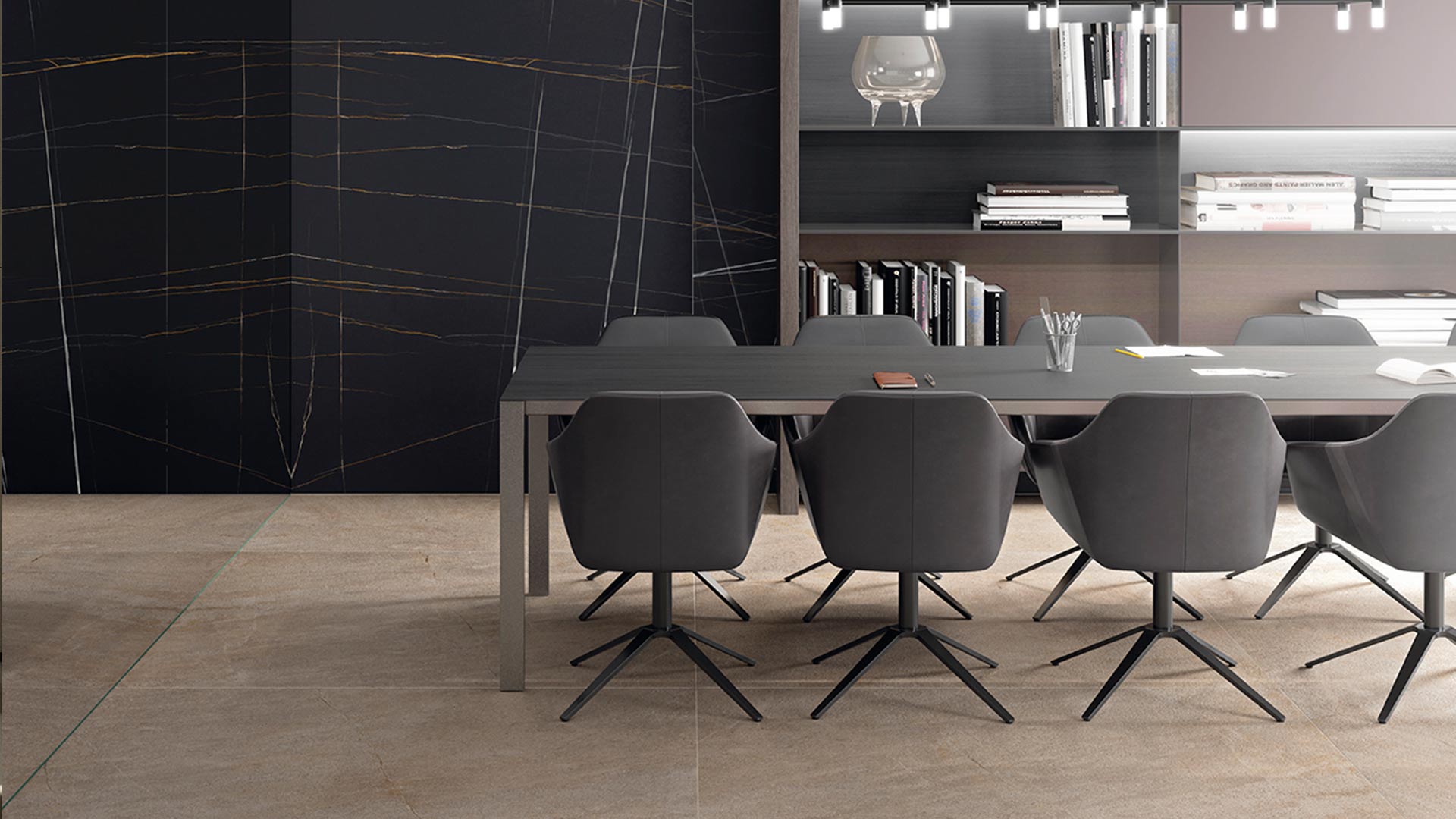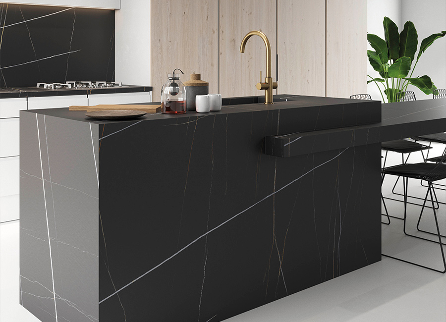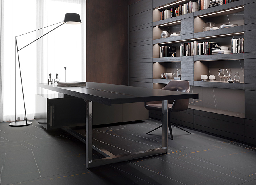 Les matériaux avec de la personnalité ne se démodent jamais. Azalai symbolise un marbre noble qui évoque l’élégance et l’exclusivité. La disposition de ses veines blanches et orangées sur fond noir forme une surface tout simplement spectaculaire.