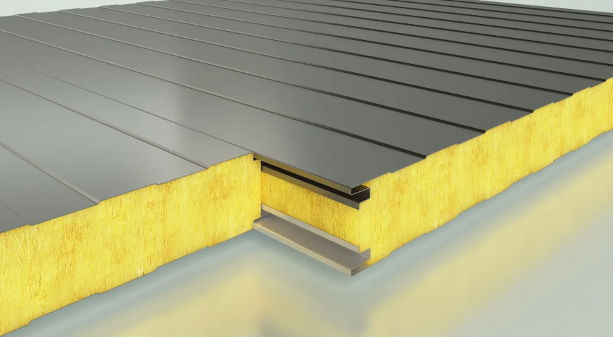Isofire Wall FG VF est un panneau sandwich utilisé pour les murs de bâtiments industriels. Il a un joint à rainure et languette et des fixations visibles.