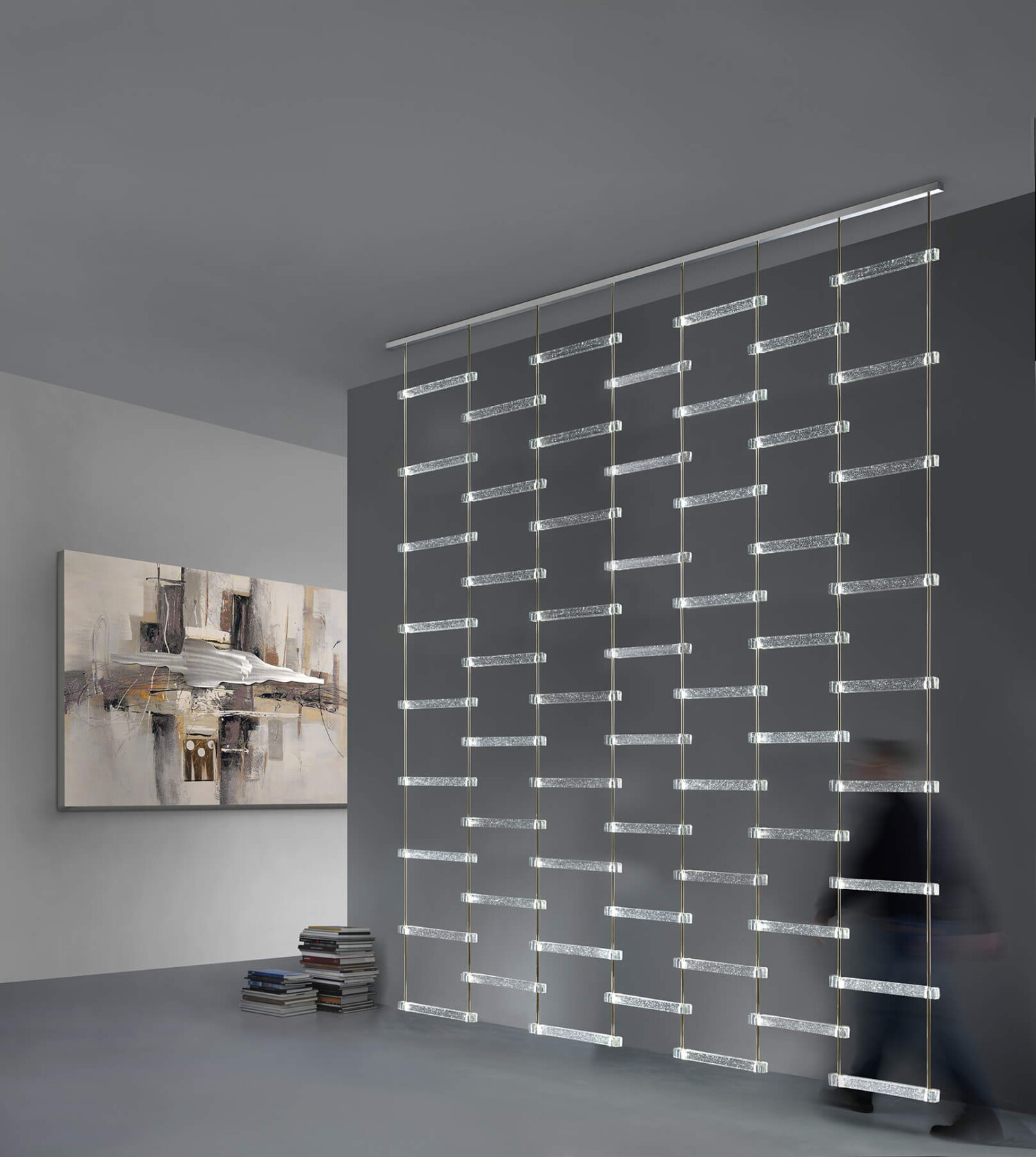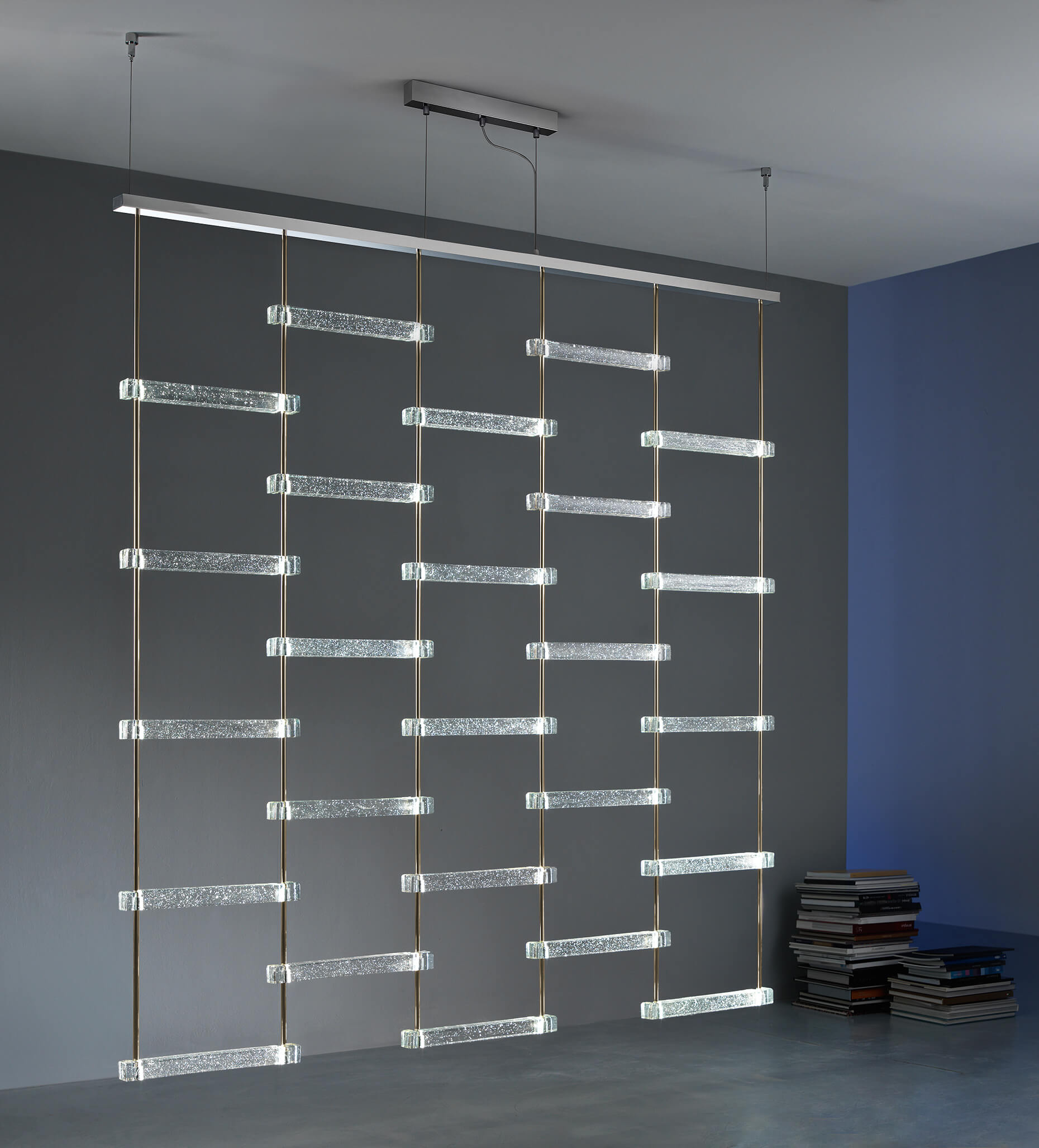 Auvent modulaire composé de barres en verre coulé avec microbulles internes éclairées par des LED. Structure métallique avec finition or clair et chrome poli.