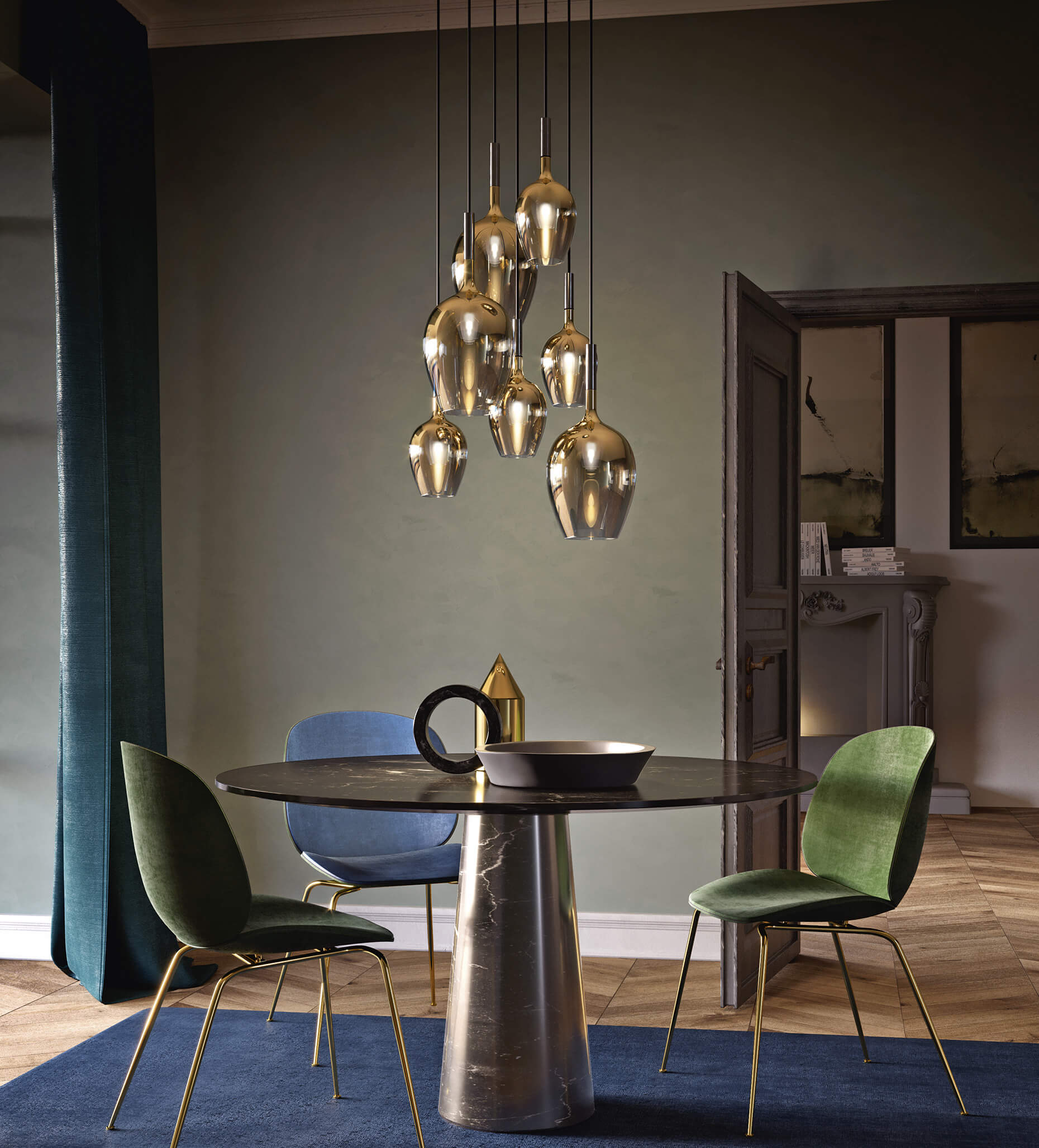 Suspensions, lampadaires, appliques et lampes de table en or rose, titane, or ou verre métallisé transparent et chrome, bronze à canon ou métal doré.