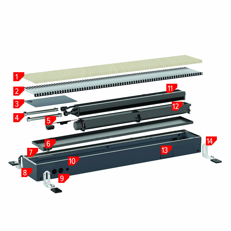 Solution de chauffage, rafraichissement et refroidissement en caniveau avec moteur intégré, encombrement minimal commençant à partir de 10 cm de profondeur au sol. Idéal pour rénovation appartements et maisons et pour le tertiaire.