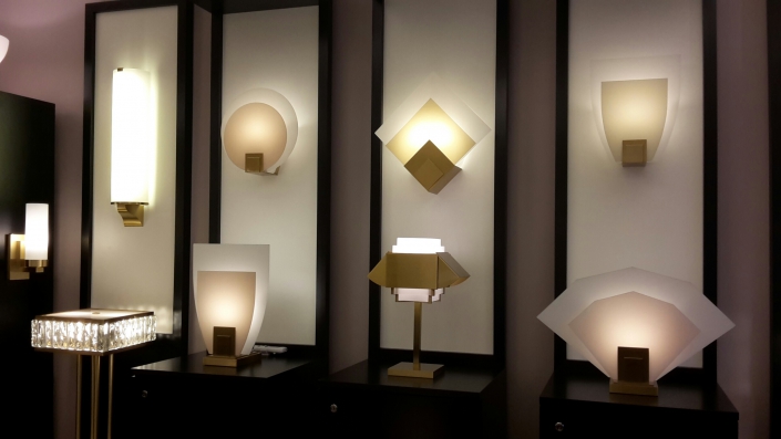 Abstractions géométriques. Tableaux de lumière, ces appliques créées en 1926 offrent tout un choix d’harmonies : verres sablés ou émaillés, monochromes ou bicolores.