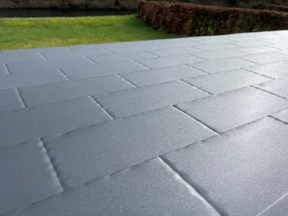 | Aspect | Panneau isolé avec motif ardoise, fixations cachées, montage perpendiculaire à la pente, pente minimale 25° | |