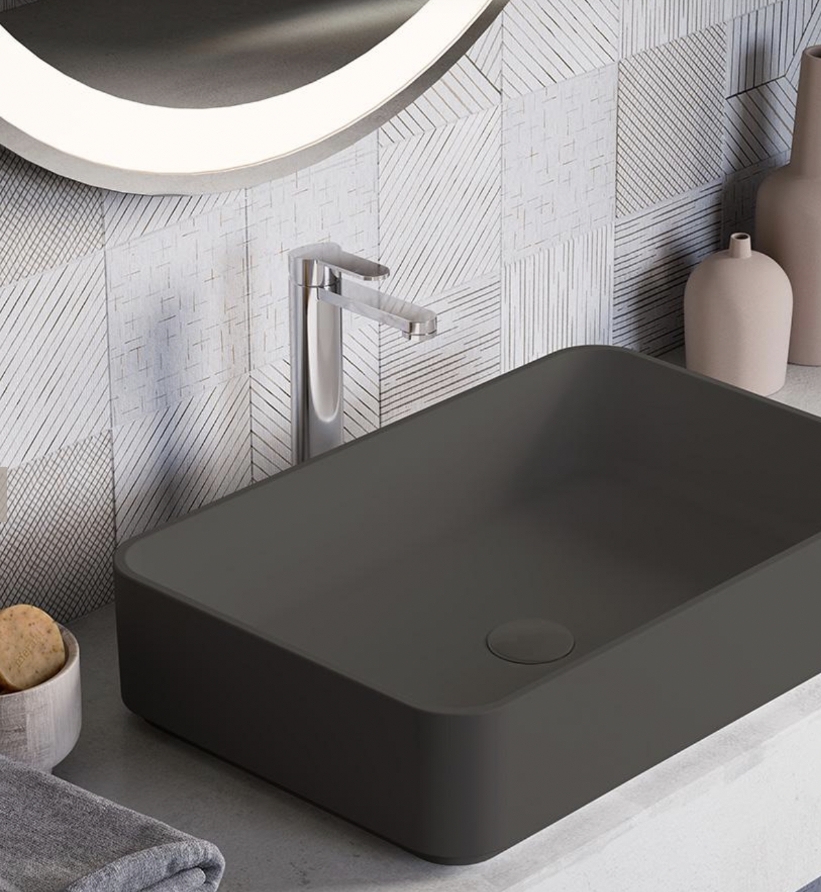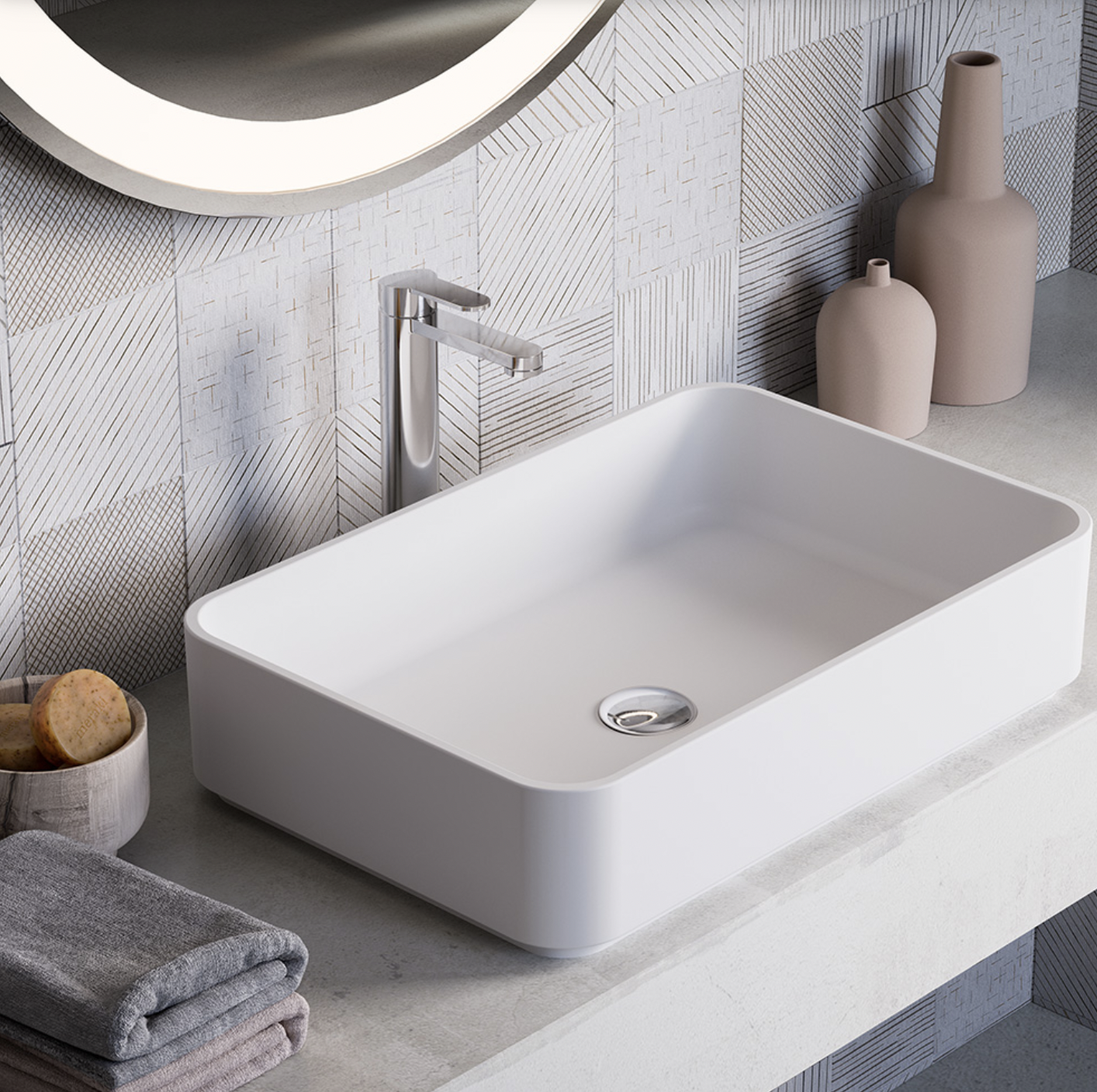 Vasque à poser rectangulaire en Mineralmarmo coloré mat ou en Solid Surface blanc mat, avec possibilité de finition extérieure Color, brillante ou mate.