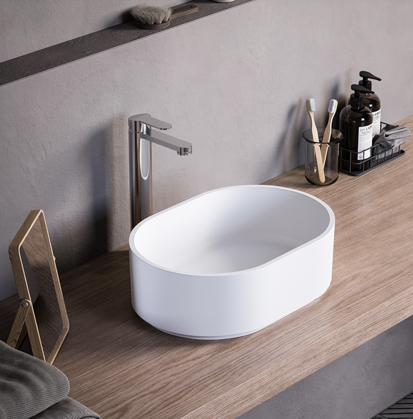 Lavabo à poser ovale en Mineralmarmo coloré mat ou en Solid Surface blanc mat, avec possibilité de finition extérieure Color, brillante ou mate.