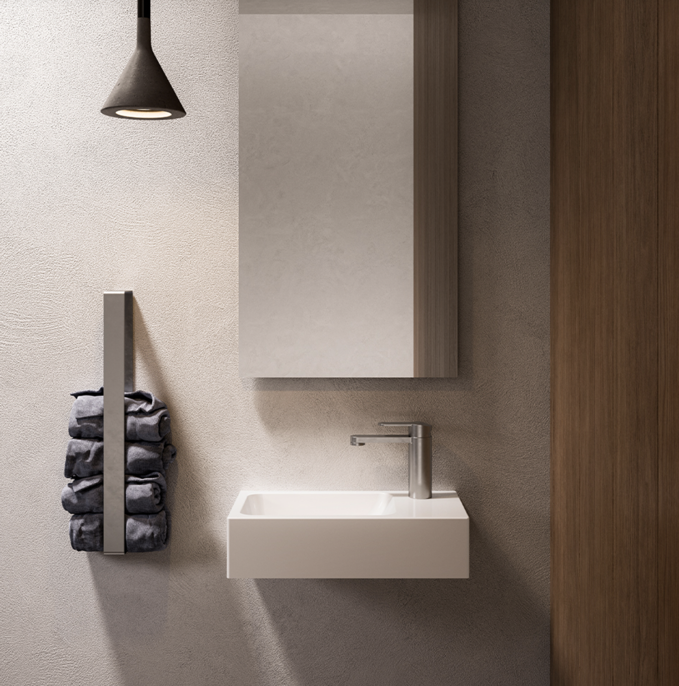 Lavabo mural ou à poser en Solid Surface blanc mat, avec possibilité de finition extérieure Color, brillante ou mate.
