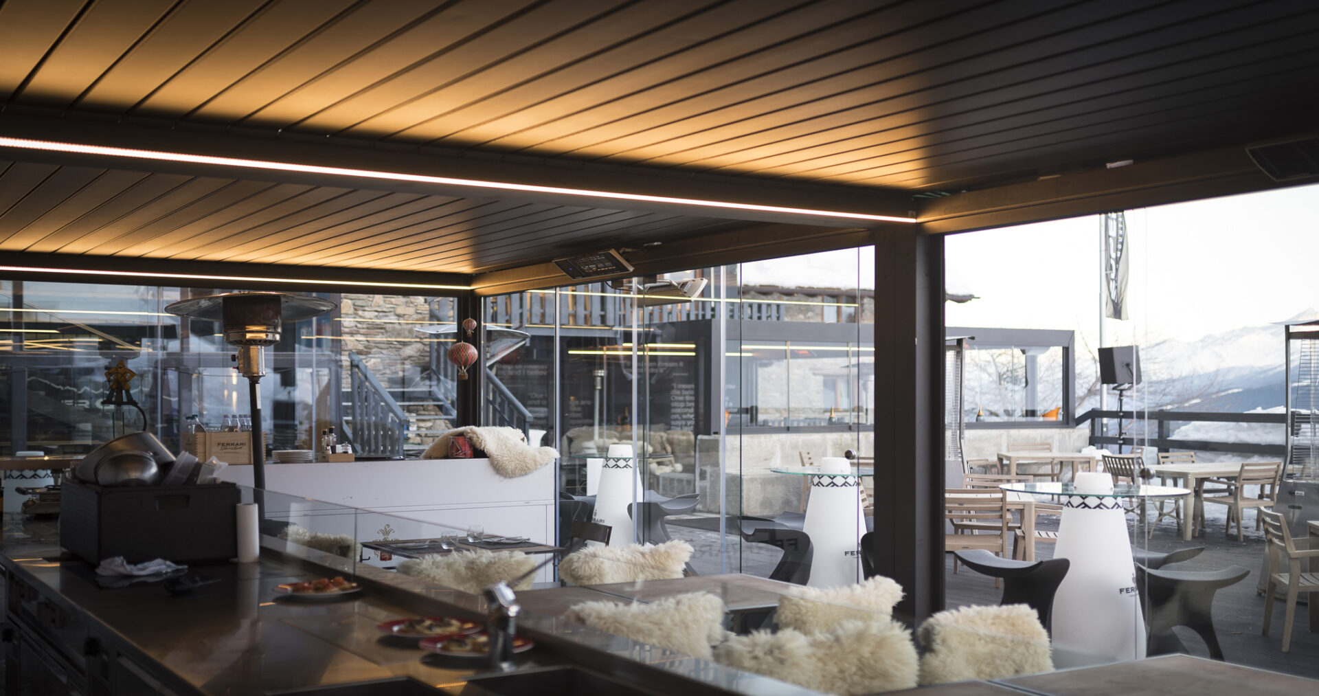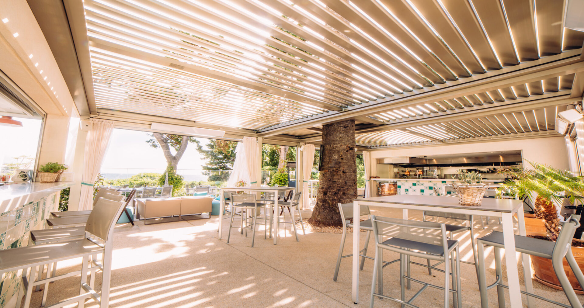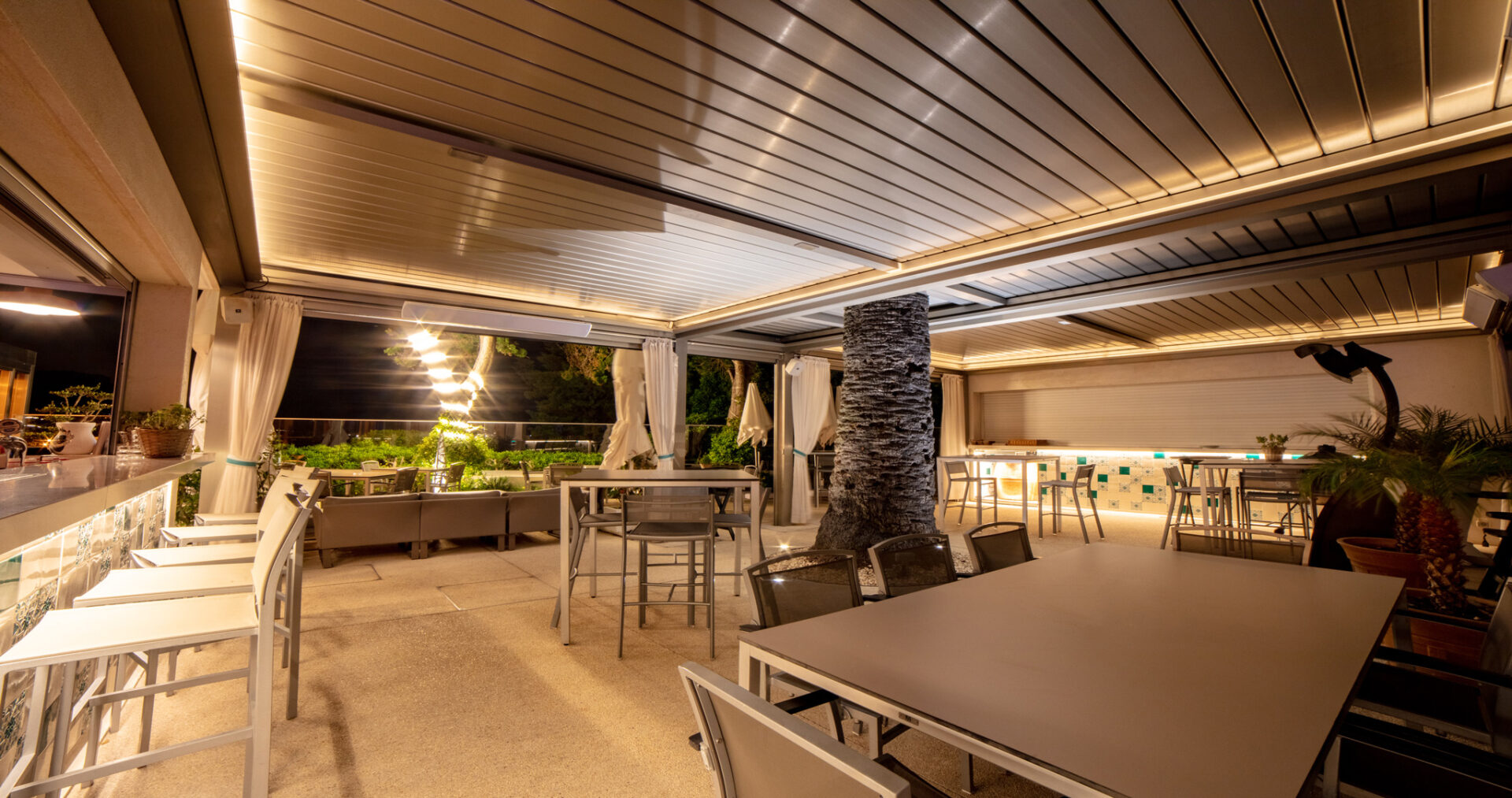 Structure d’ombrage autoportante en aluminium avec toit à lames orientables composé d’un profil de gouttière périmétrique qui permet la rotation des lames et le drainage de l’eau. Le mouvement s’effectue grâce à l’utilisation de moteurs linéaires. Résistance au vent garantie jusqu’à la classe 6 selon la norme UNI EN 13561.