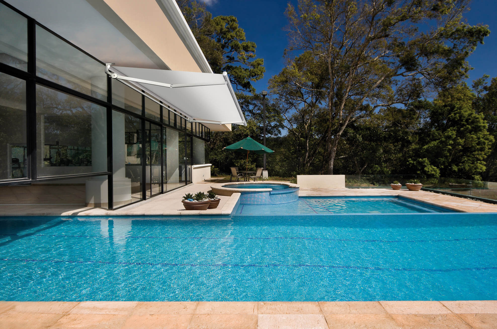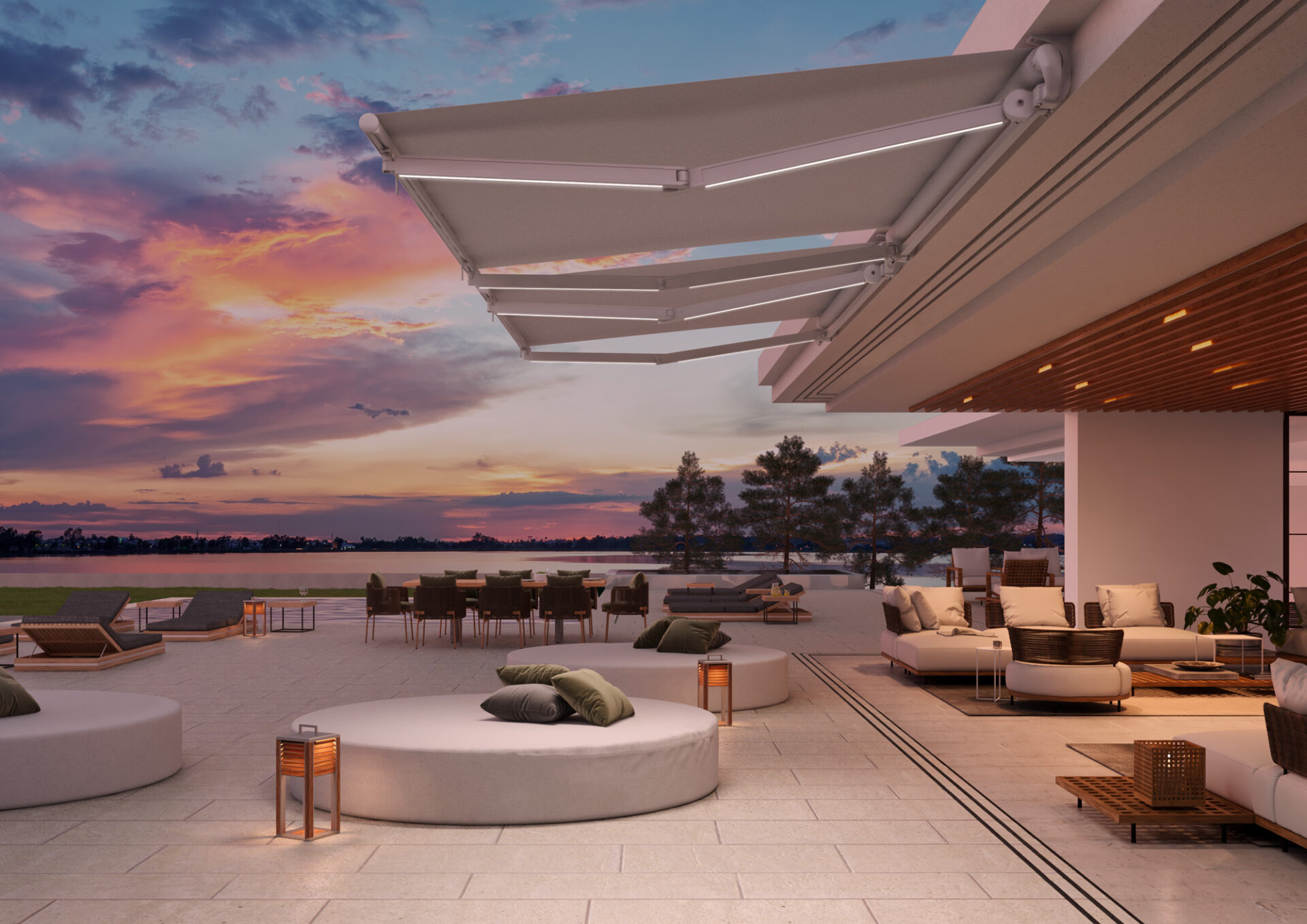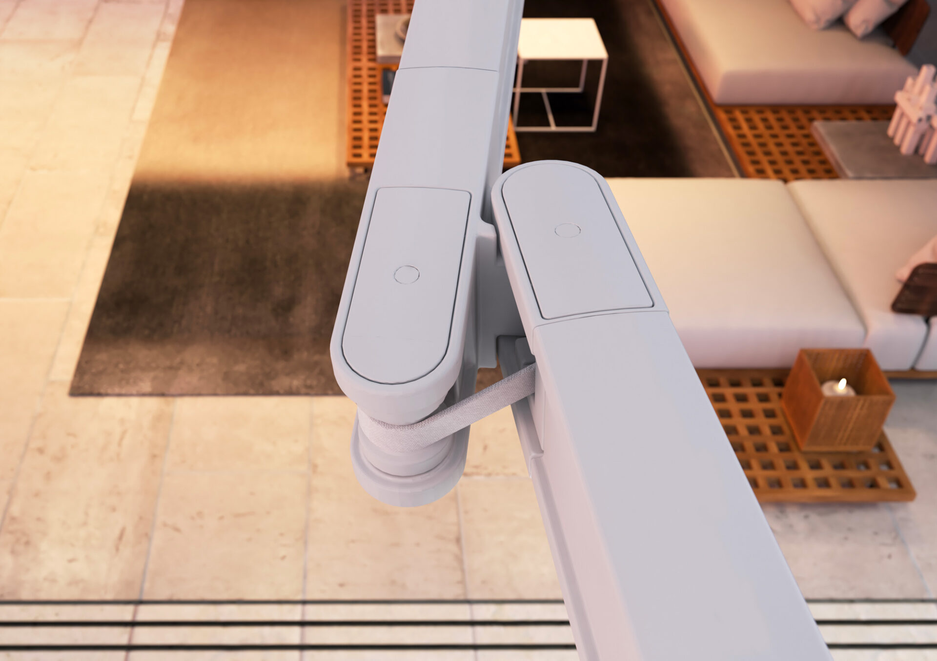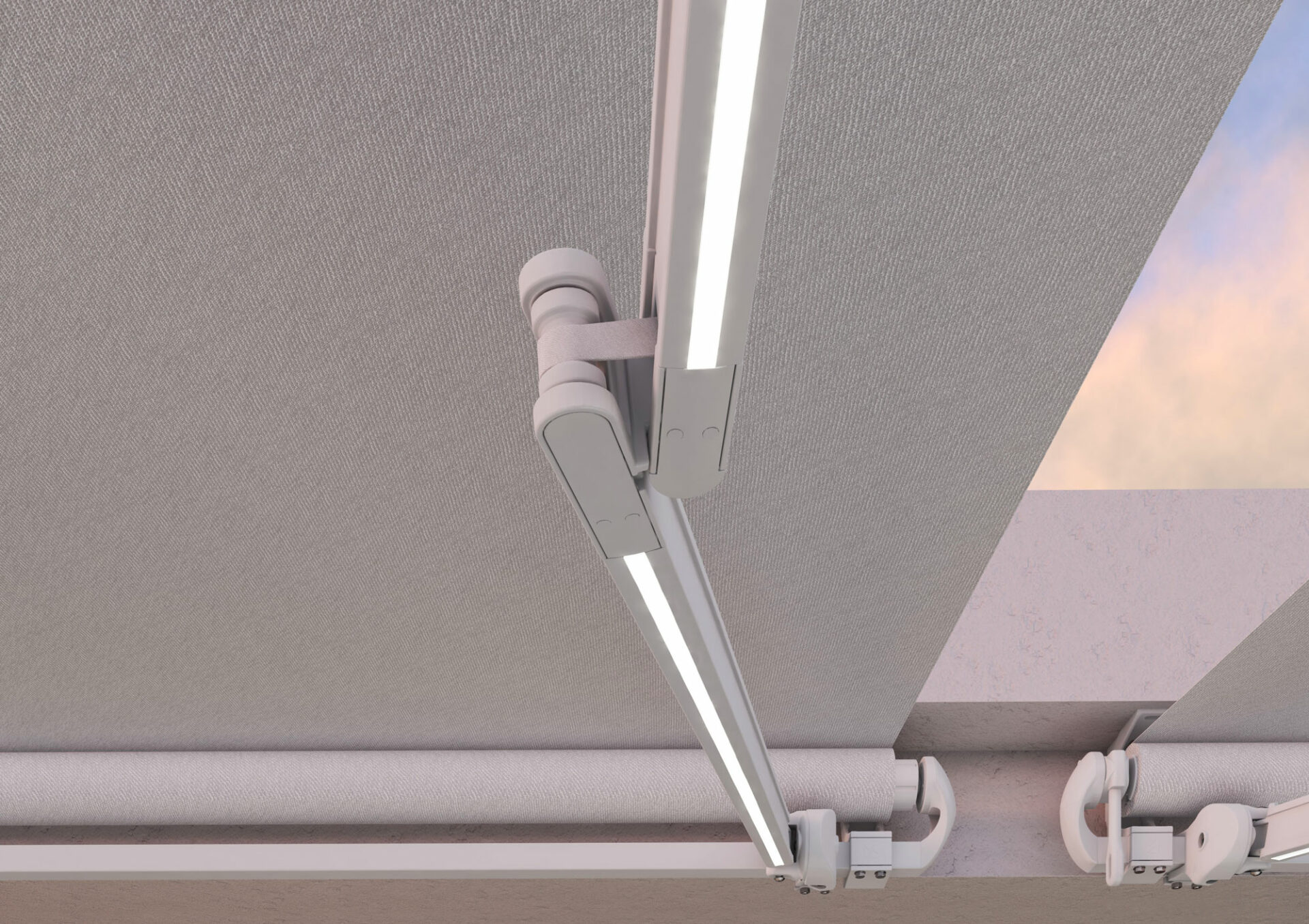 Auvent à bras motorisé sur barre carrée 40×40 mm.