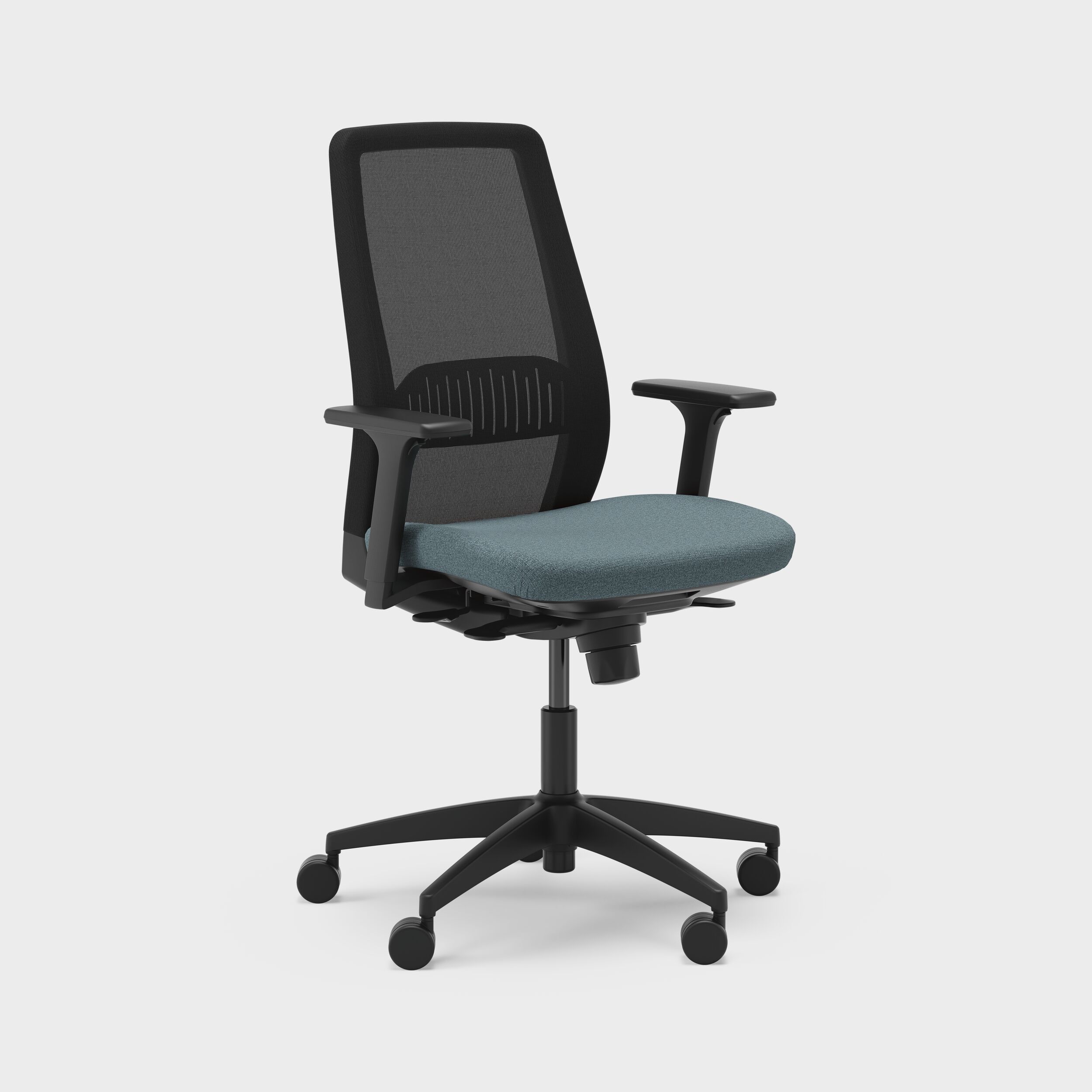 Siège de travail simple et fonctionnel avec assise en tissu et dossier en résille. Accoudoirs 1D réglables en hauteur.