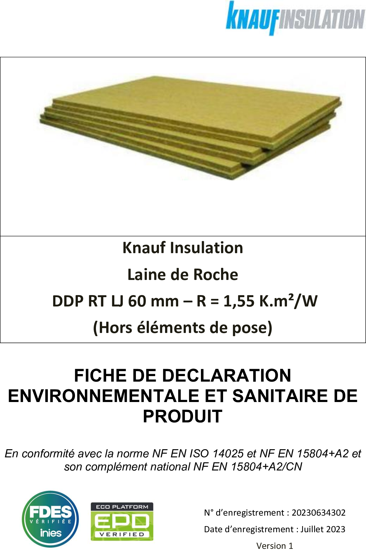 Le produit Laine de roche DDP RT du fabicant KNAUF INSULATION a une épaisseur de 60 mm, une longueur de 2000 mm, une largeur de 1200 mm,