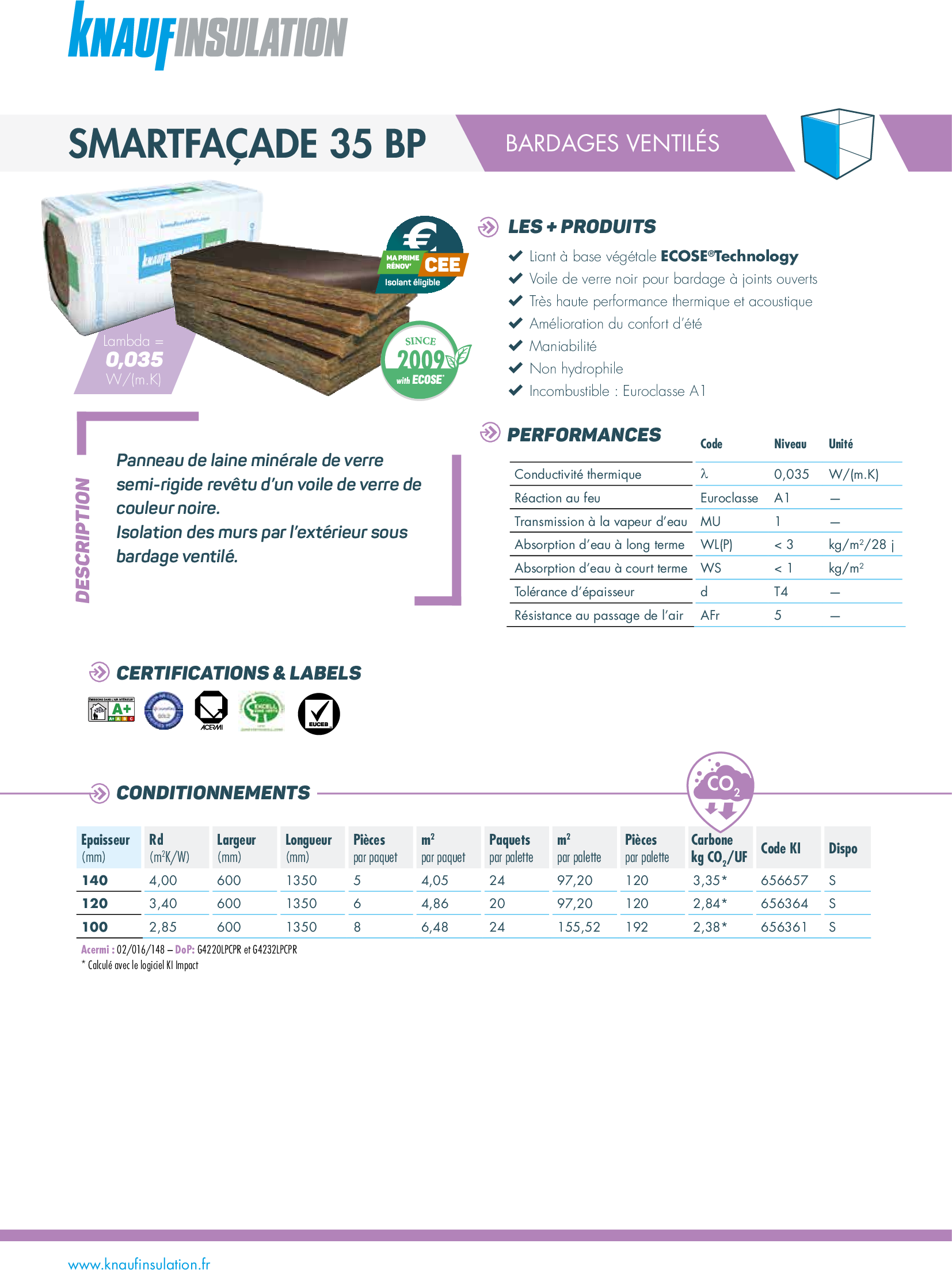 Le produit Smartfaçade 35 BP du fabicant KNAUF INSULATION a une épaisseur de 100 - 140 mm,