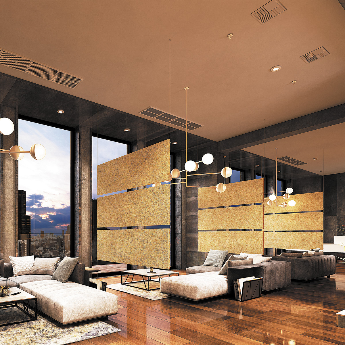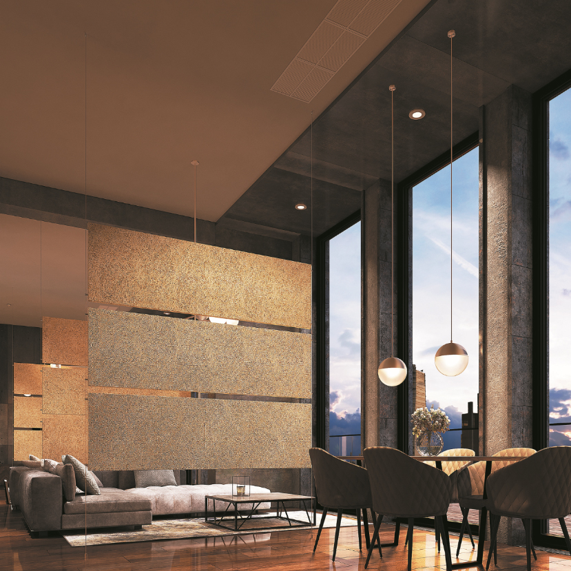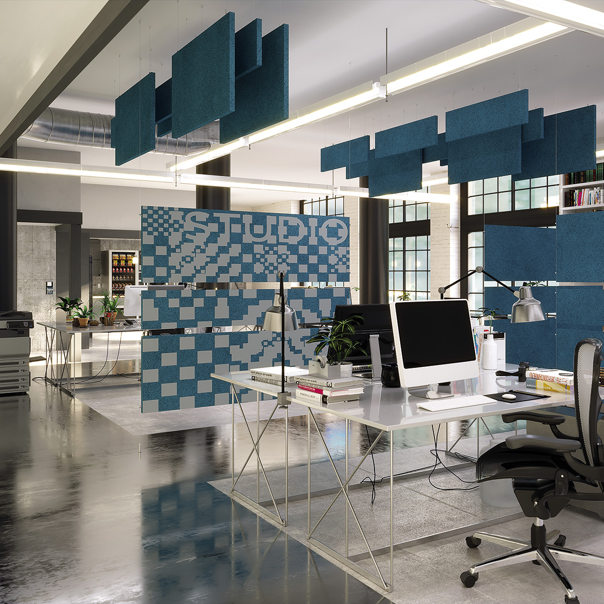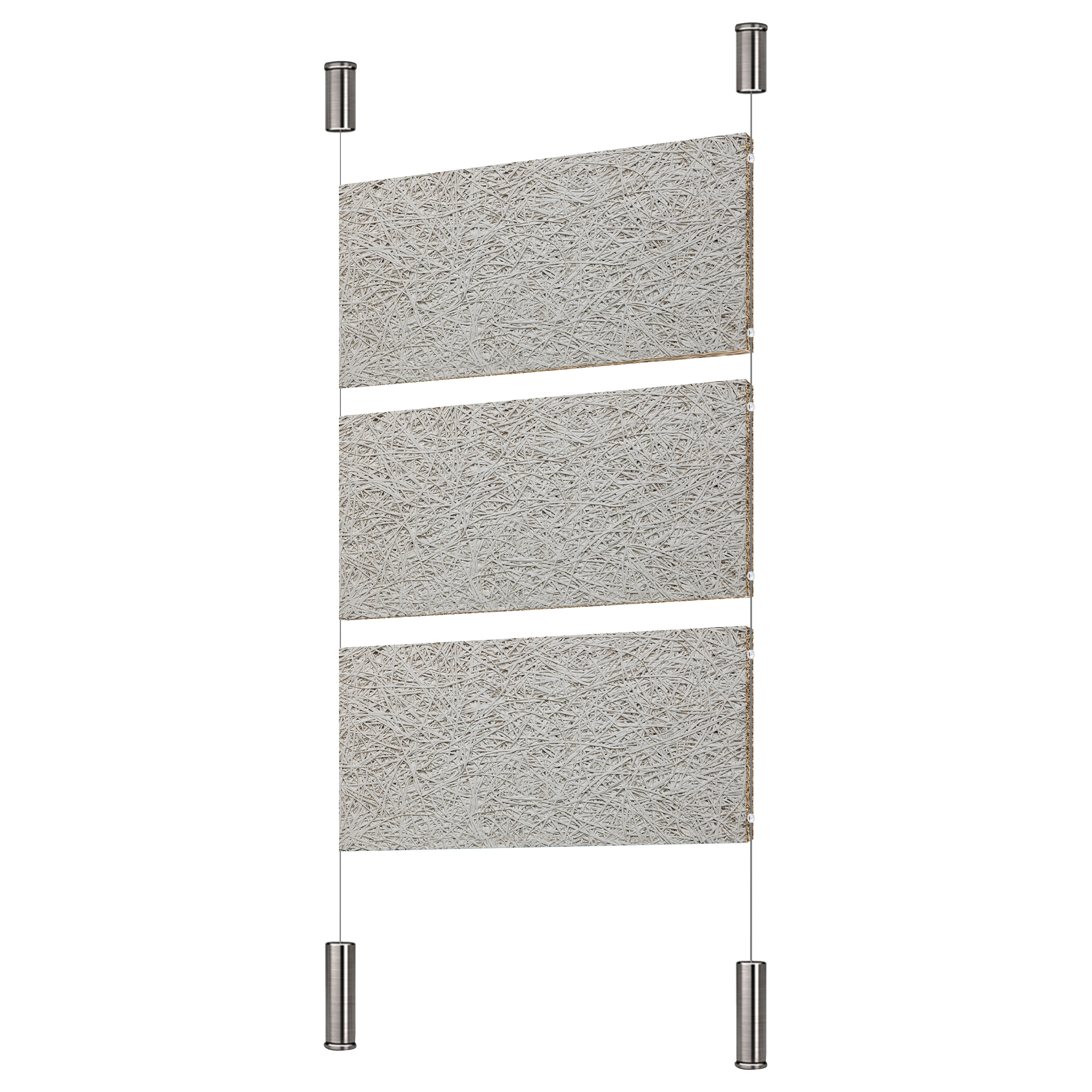 Organic Claustra est une baffle acoustique superposable et modulable constituée de panneaux Organic rectangulaires d’épaisseur 35 mm suspendus entre 2 câbles fixés au sol et au plafond.