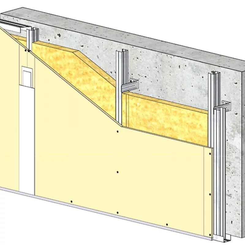 Contre-cloison constituée par l’assemblage d’une, deux ou trois plaques de parement en plâtre Knauf HydroProof® vissées sur la même face d’une ossature en acier galvanisé composée de rails, montants et fourrures.