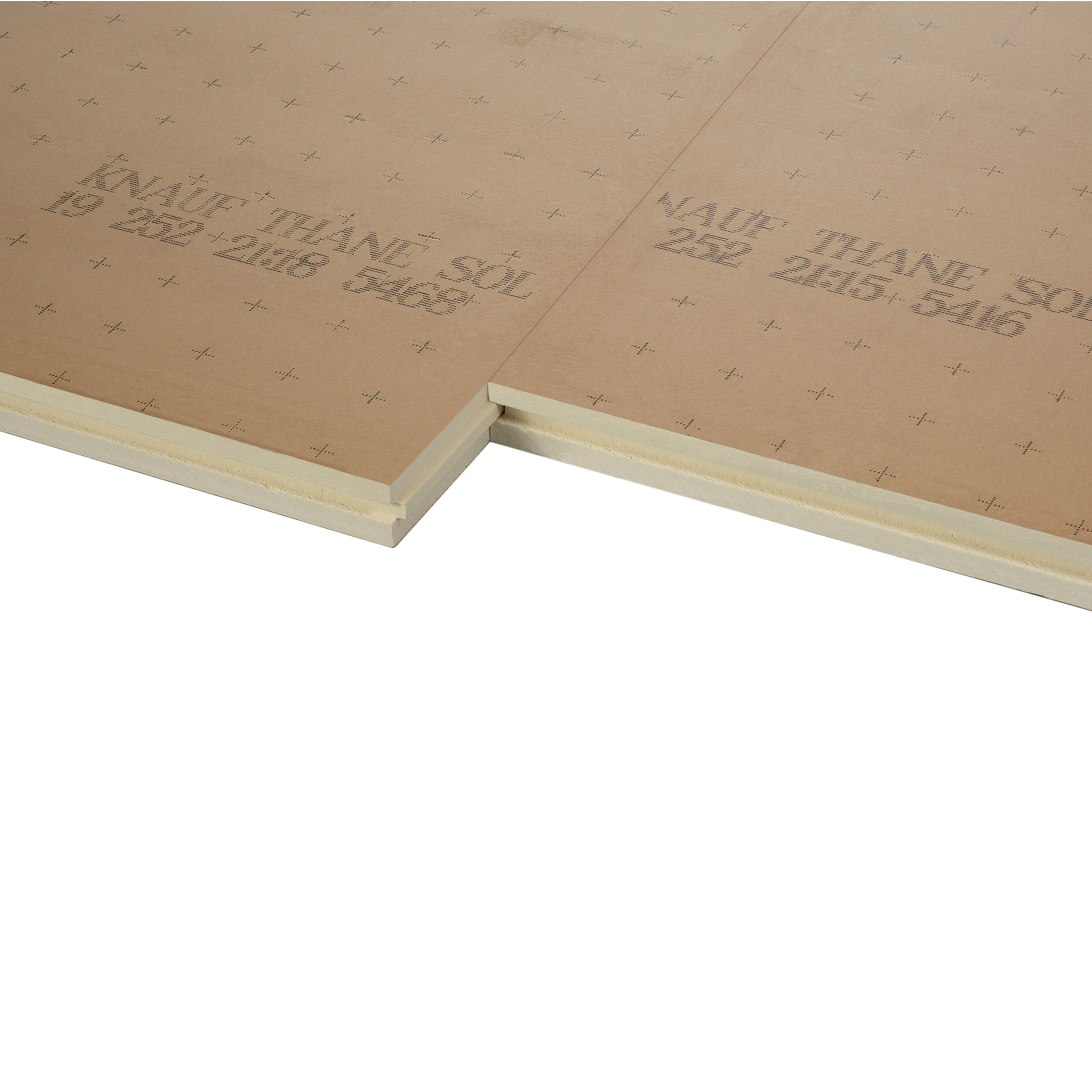 Knauf Thane Sol est un panneau composé d'une âme en mousse rigide de polyuréthane et de deux parements composites résistant à l'humidité, conforme à la norme NF EN 13165.