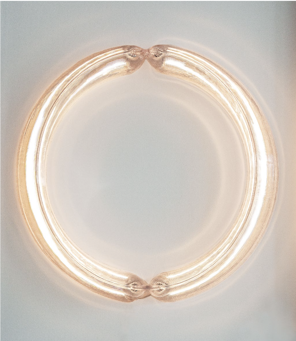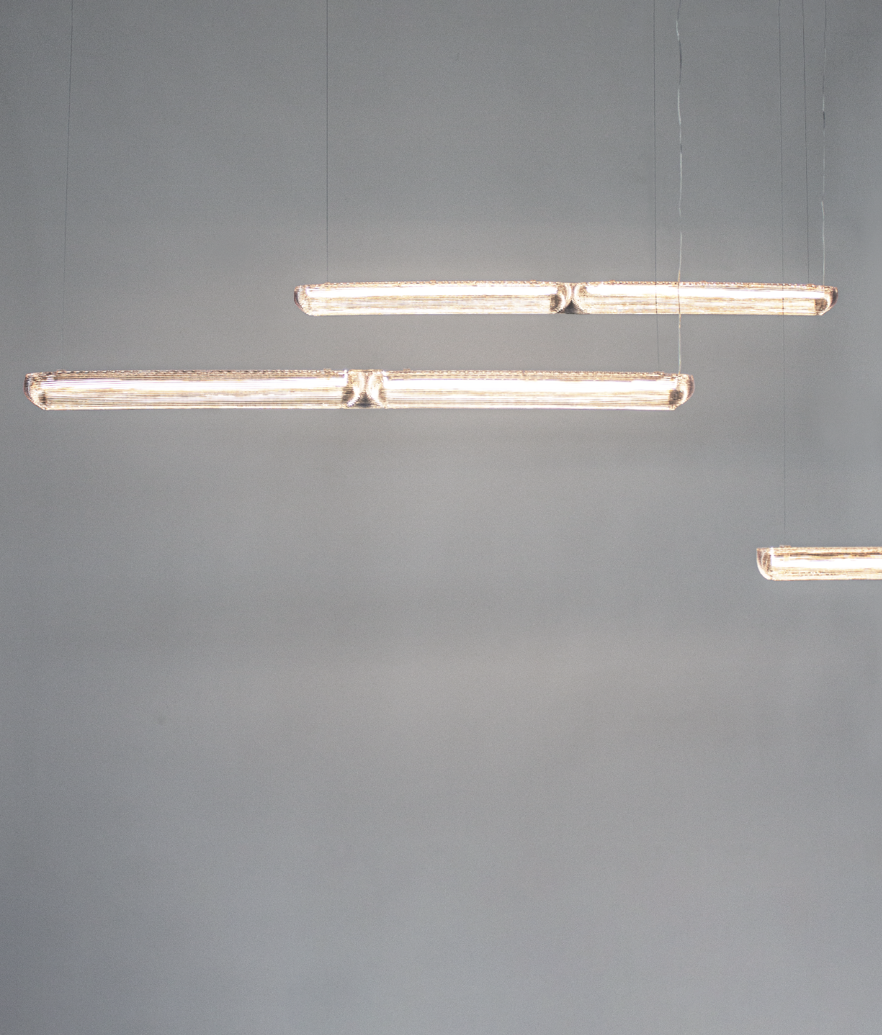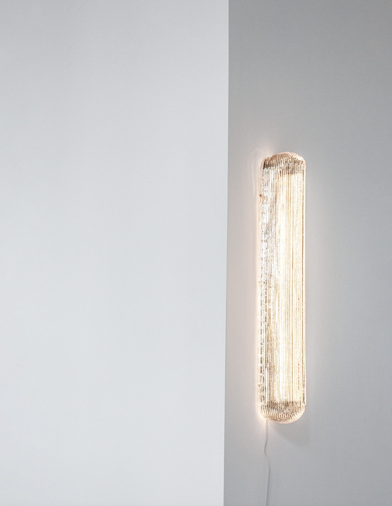 Un luminaire en applique ou en suspension avec une transparence irisée qui conduit une lumière délicate. Ses liaisons créent une illusion organique et asymétrique. Fabriqué à partir de matériaux recyclés, il allie élégance et respect de l’environnement.