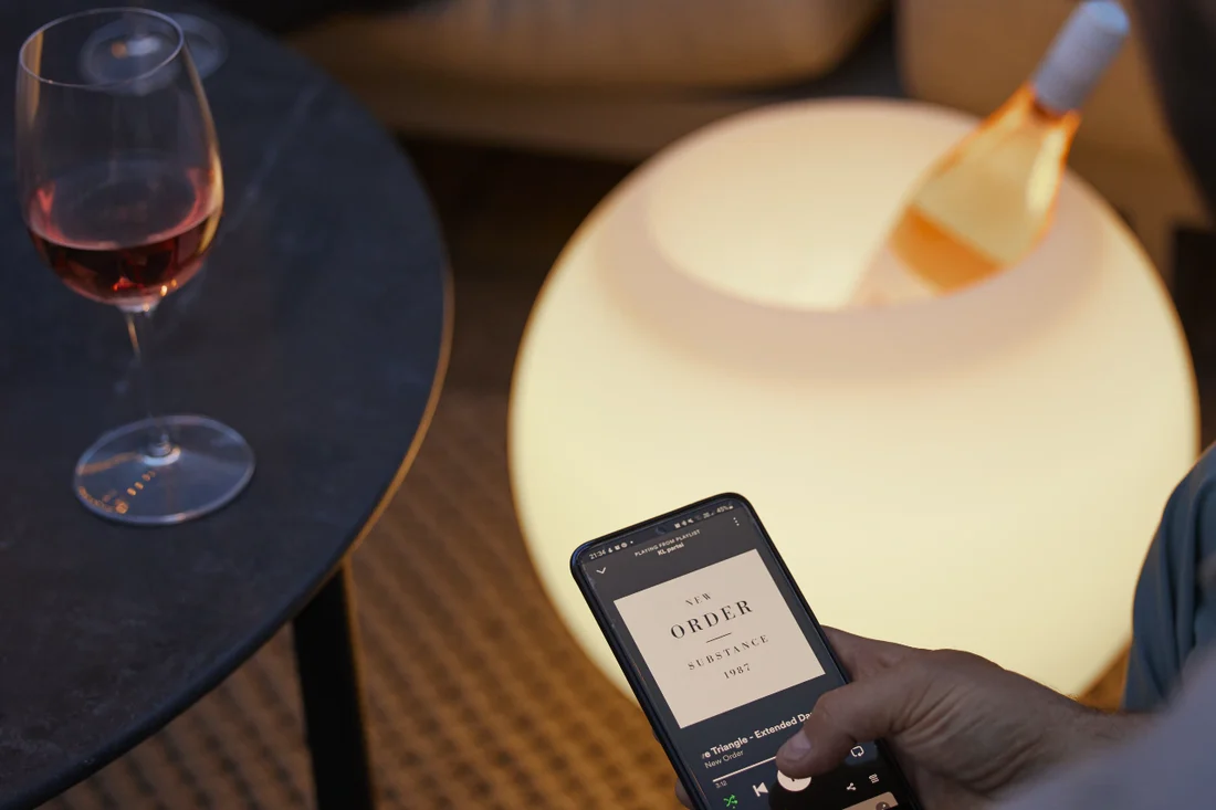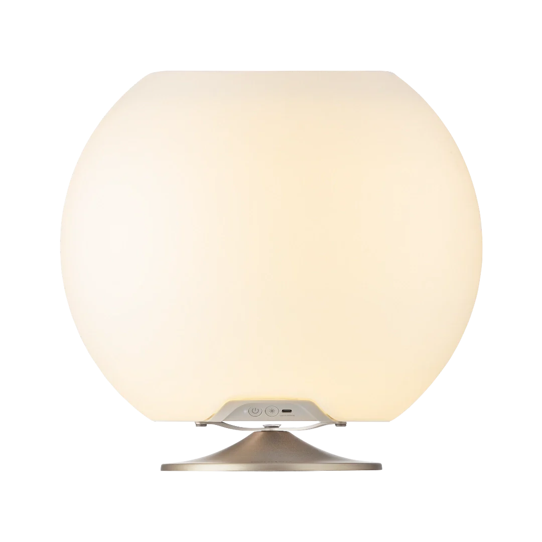 Le Kooduu Sphere en Argent Brossé est une lumière LED enceinte Bluetooth et dimmable élégante et arrondie avec un porte-boisson intégré. Sa forme sphérique distribue uniformément une lumière chaude et dimmable et un son équilibré grâce à la technologie Bright Sound™ de Kooduu et à l'approche géométrique et minimaliste de Jacob Jensen Design.