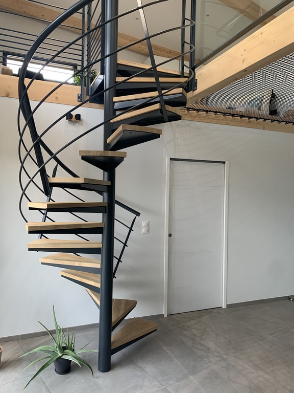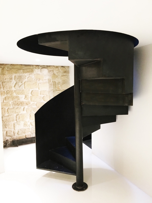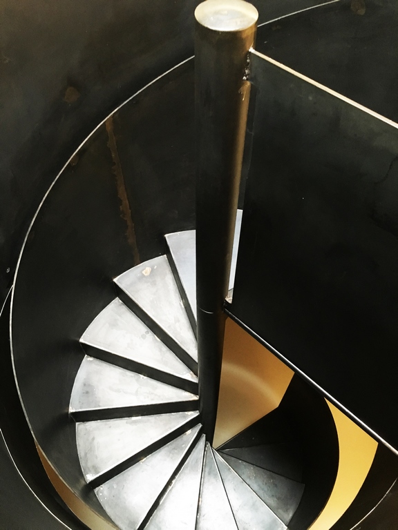Une tôle pliée formant d’un seul tenant marche et contremarche s’enroule autour d’un mât central.