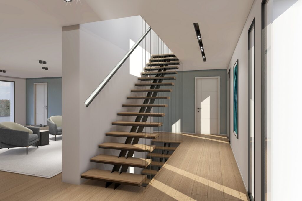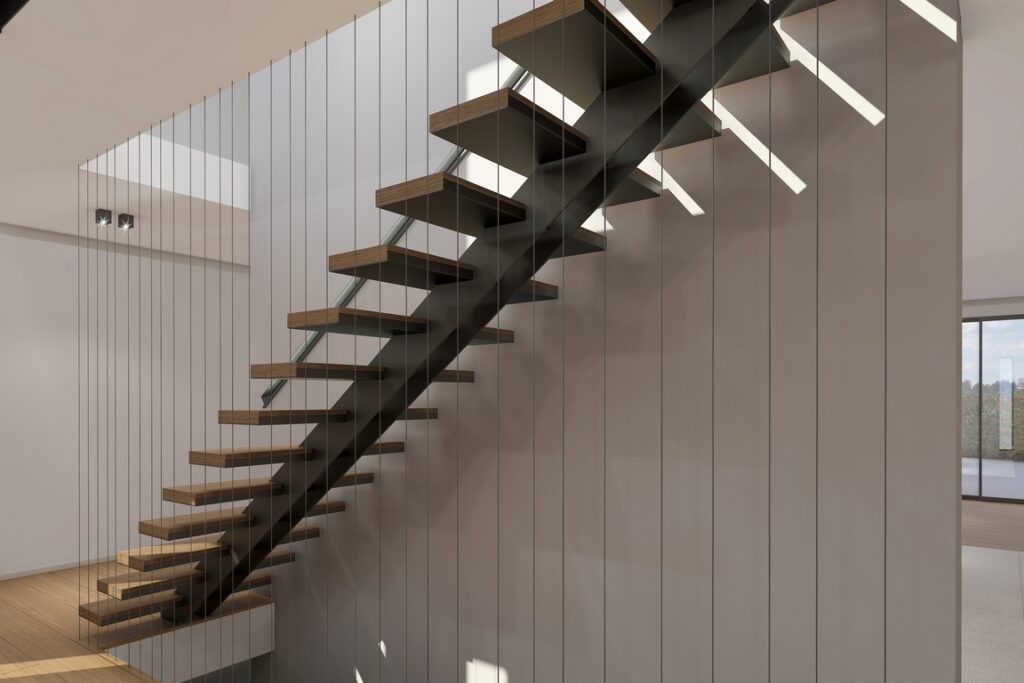 Sans contremarche, cet escalier limon central en acier laisse passer la lumière et offre une perspective traversante de part et d’autre de l’ouvrage.