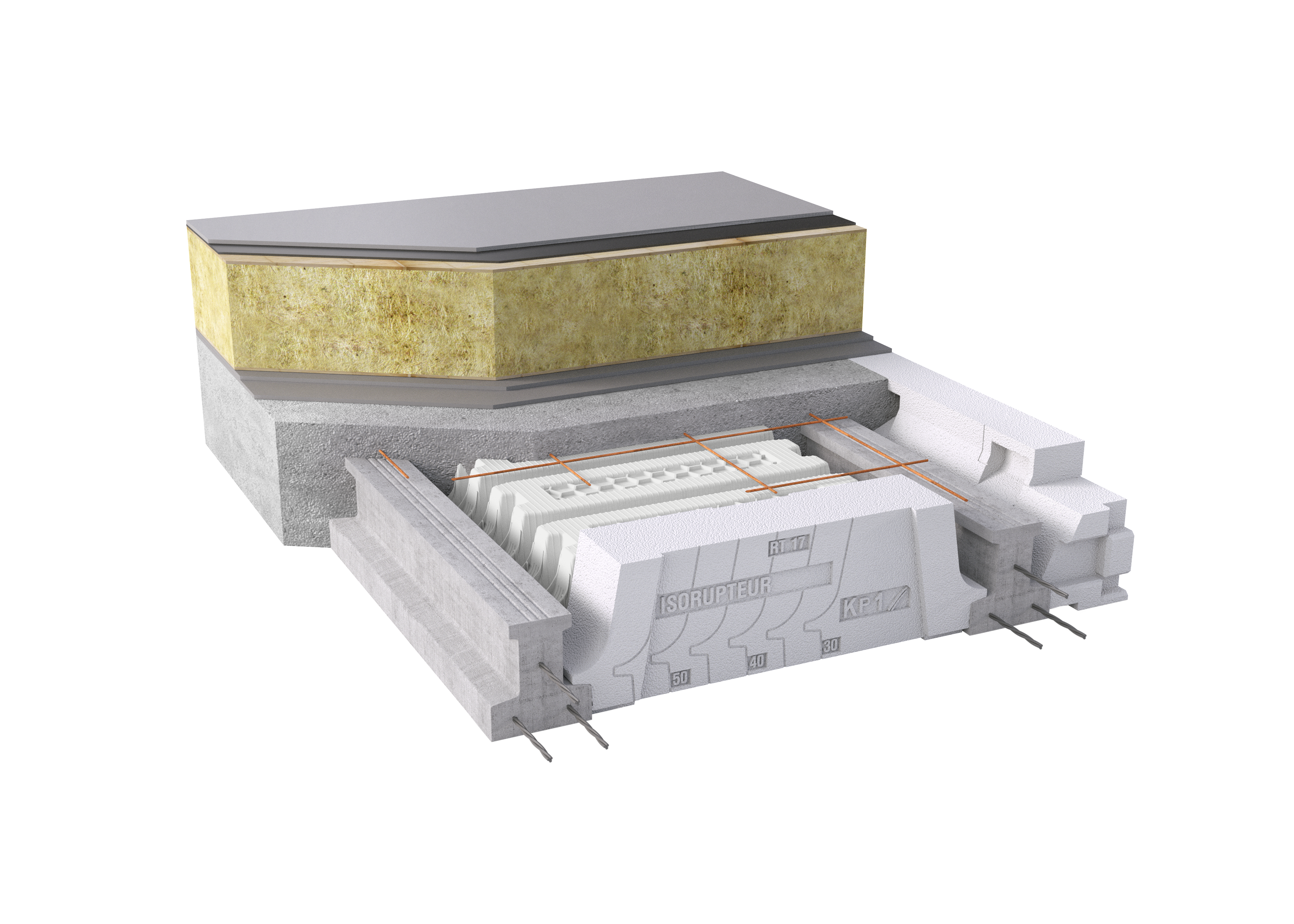 • Système de plancher pour toiture-terrasse, composé de poutrelles béton légères LX12, d’entrevous légers EMX, de rupteurs de ponts thermiques Isorupteurs et d’une dalle de compression armée, coulée sur chantier ;