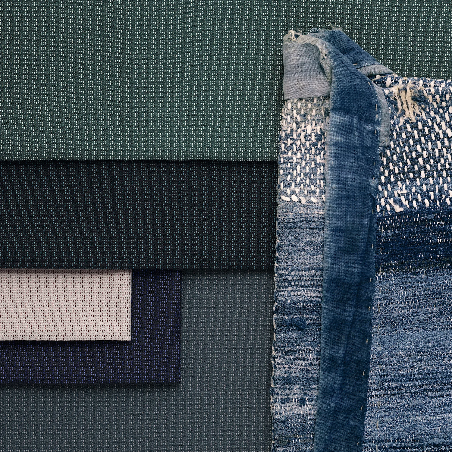 Ame illustre le potentiel du polyester recyclé de textile à textile. Il offre le même niveau de performance que le polyester vierge tout en étant recyclable. Tissé avec deux fils de différentes épaisseurs, Ame présente un micromotif rythmique, qui imite la couture à la main de la méthode Sashiko. Sashiko, un mot japonais signifiant « petits points », est une forme de broderie fonctionnelle utilisée au Japon pour réparer les textiles usés. Ce motif est mis en valeur par l’utilisation de deux couleurs contrastées pour le fil de surpiqûre et la base.