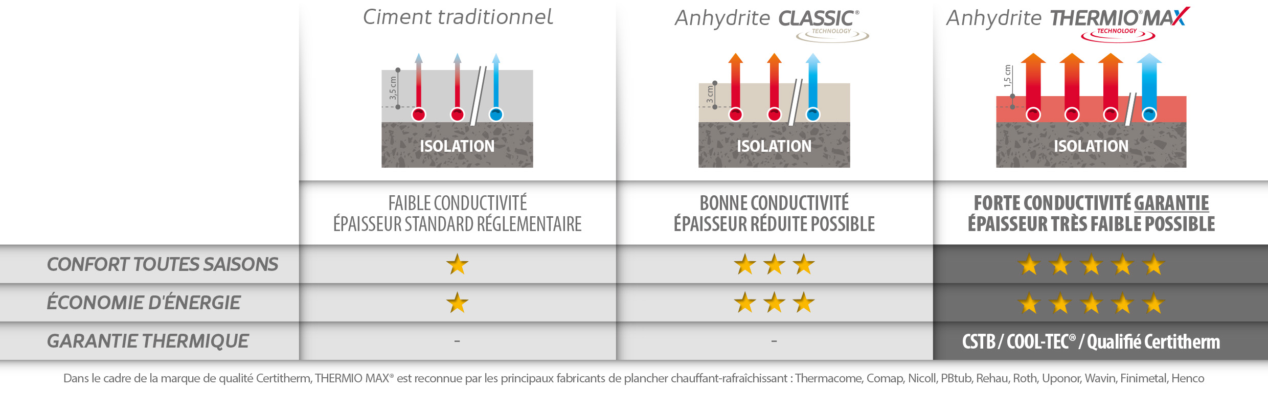 Spécialement conçue pour l’enrobage des planchers chauffants-rafraîchissants à eau, la technologie THERMIO MAX offre des garanties de performances thermiques élevées, et un confort idéal en toutes saisons, en mode chauffage mais également en mode rafraîchissement, grâce à l’intégration de la technologie COOL-TEC®.