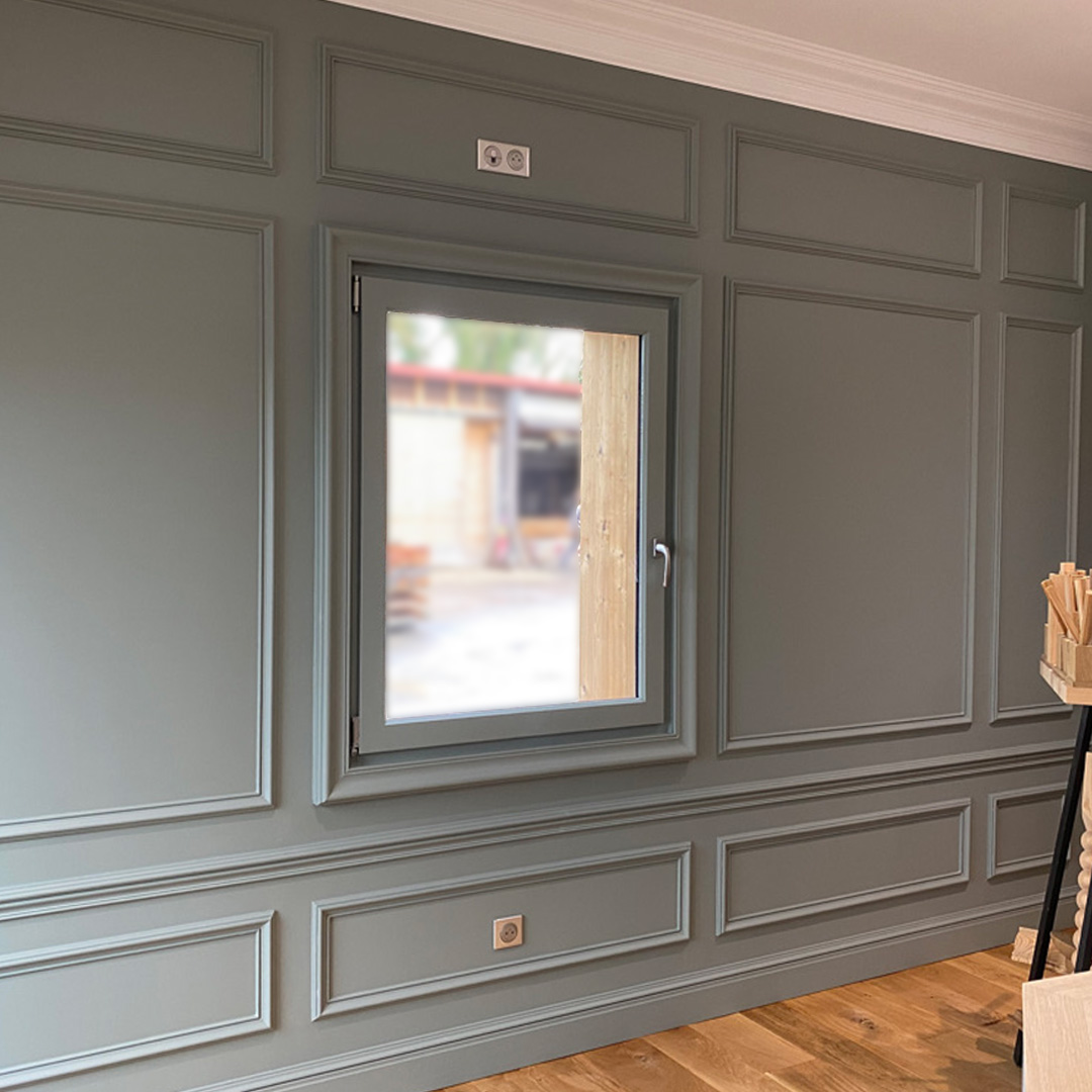 Grâce à sa largeur de 85 mm, ce chambranle masque efficacement les irrégularités et crée une transition visuelle cohérente entre huisserie et cloison. Sa section importante renforce la perception de profondeur et affirme le style de l’encadrement.
