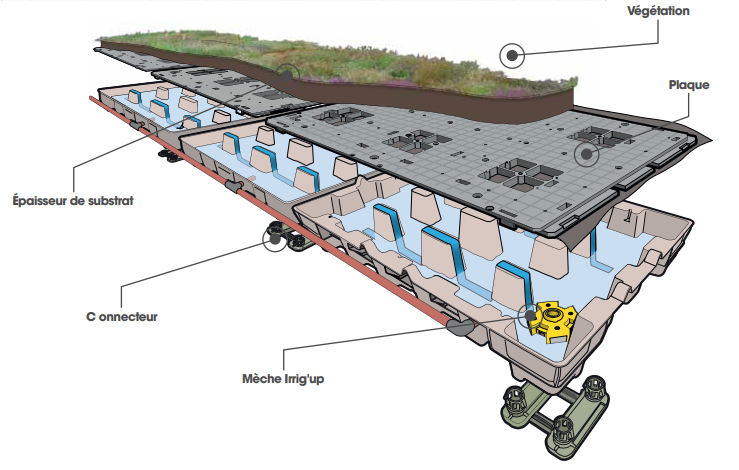 Il annule les pics de pluie, diminue le volume global d’eau rejetée au réseau par évapotranspiration des végétaux, optimise par irrigation la ressource naturelle en eau et protège l’étanchéité.