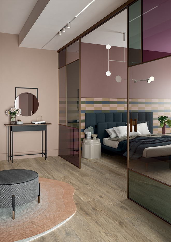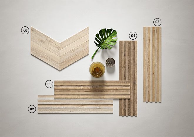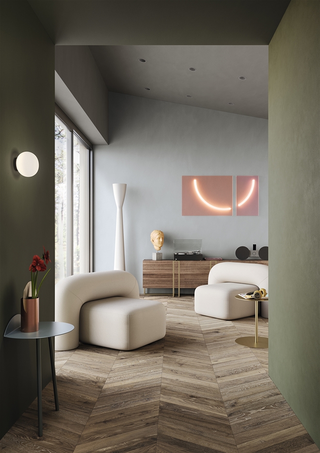 Le seul raffinement graphique consiste à associer un grain foncé et un grain presque blanc, typiques des bois traités avec des cires naturelles. Une touche de rusticité mesurée pour un effet de bois aux dégradés contenus dans une composition étonnamment équilibrée.