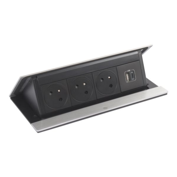 Le produit Incara Pop-up équipé de 3 prises 2P+T Surface et 1 chargeur USB Type-A+Type-C 15W avec cordon - 8 modules inox du fabricant LEGRAND classé dans la catégorie Electricité - Eclairage > Appareillages électriques encastrés > Interrupteurs - prises est référencé dans la Matériauthèque digitale Materiaux.archi.