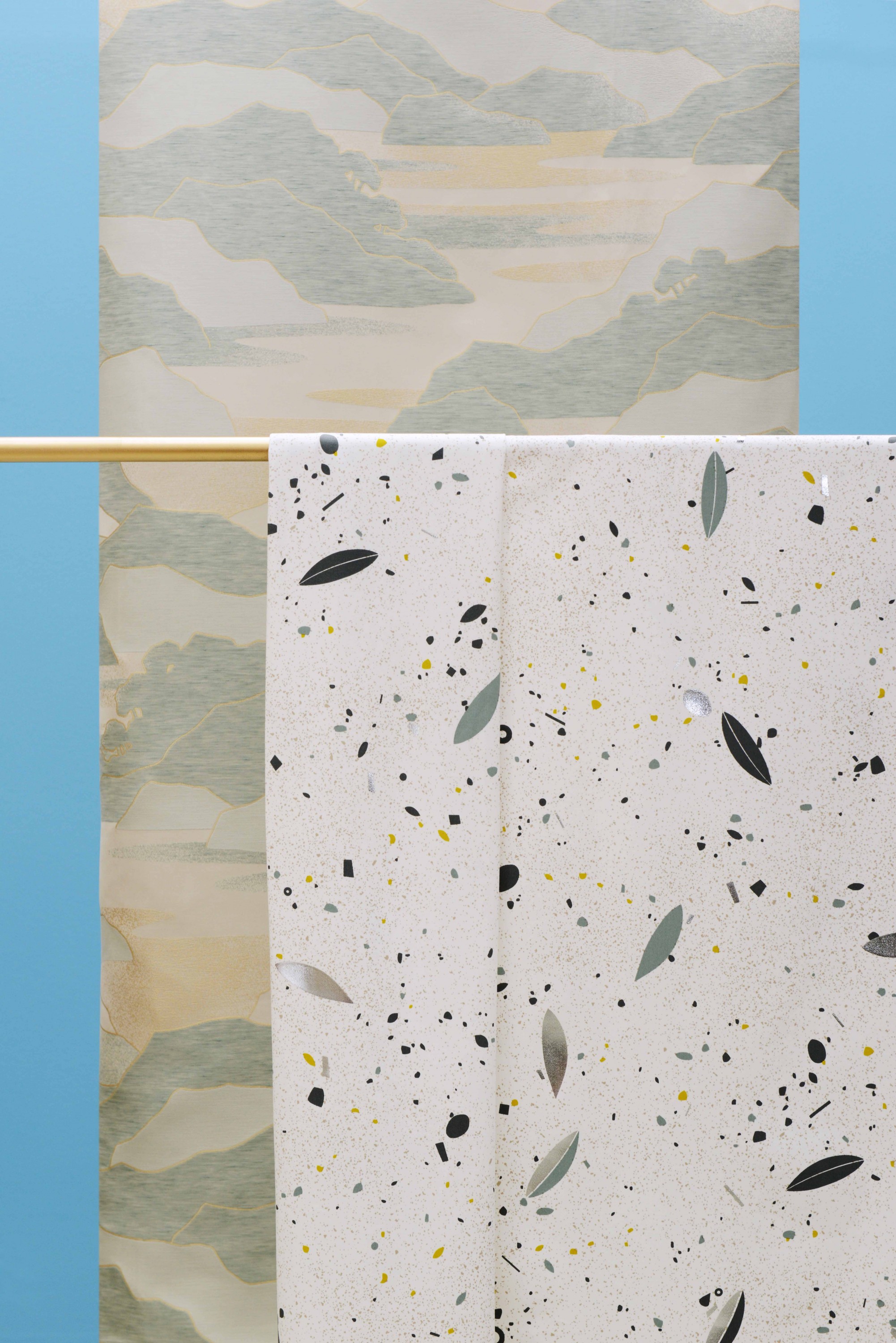 Une fin d après-midi sur un terrain de pétanque à Saint Tropez. Les feuilles d olivier caressent le sol, le sable a été troublé par les pieds des joueurs et les formes s arrondissent avec la soirée qui arrive Oléa est un jeu de matières imprimées au cadre sur un joli satin de coton, fait d empiècements et de pointillés parsemés sur un fond blanc poudré de couleurs. Tantôt dans l ombre, tantôt dans la lumière, la feuille d olivier, pépite de la Riviera, fait scintiller l ensemble de la composition grâce à l impression de laminations métallisées or, argent ou cuivre.