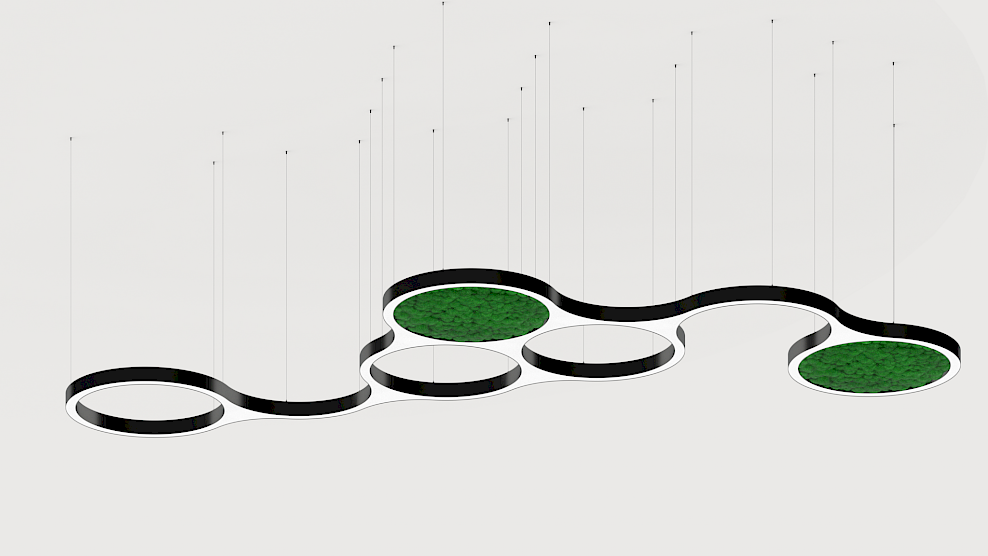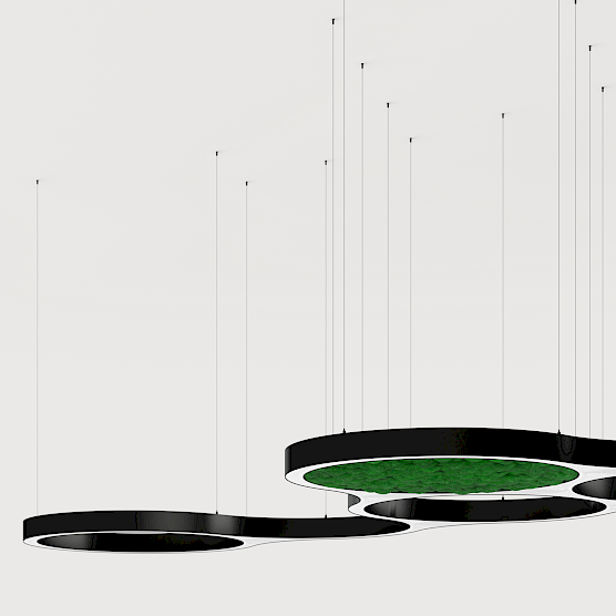 Élément acoustique interne en option pour réguler le temps de réverbération. Absorbeur de bruit pour un large spectre de fréquences, en laine durable ou en mousse verte. Diffuseur opale satiné pour l’éclairage général. Convertisseur intégré dans les boîtiers de luminaires, au choix facilement commutable ou dimmable en continu (DALI, Touch-Dim, Casambi).