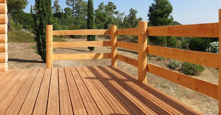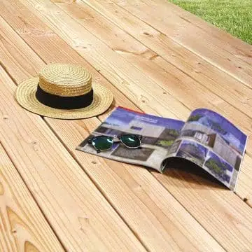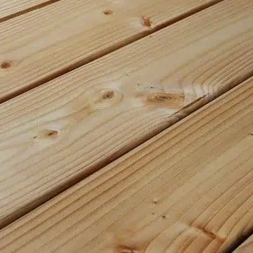 Une terrasse pin du nord avec ses nœuds marqués rustiques et un traitement autoclave de classe 4 vert pour résister aux intempéries, insectes et champignons, durable et résistant.