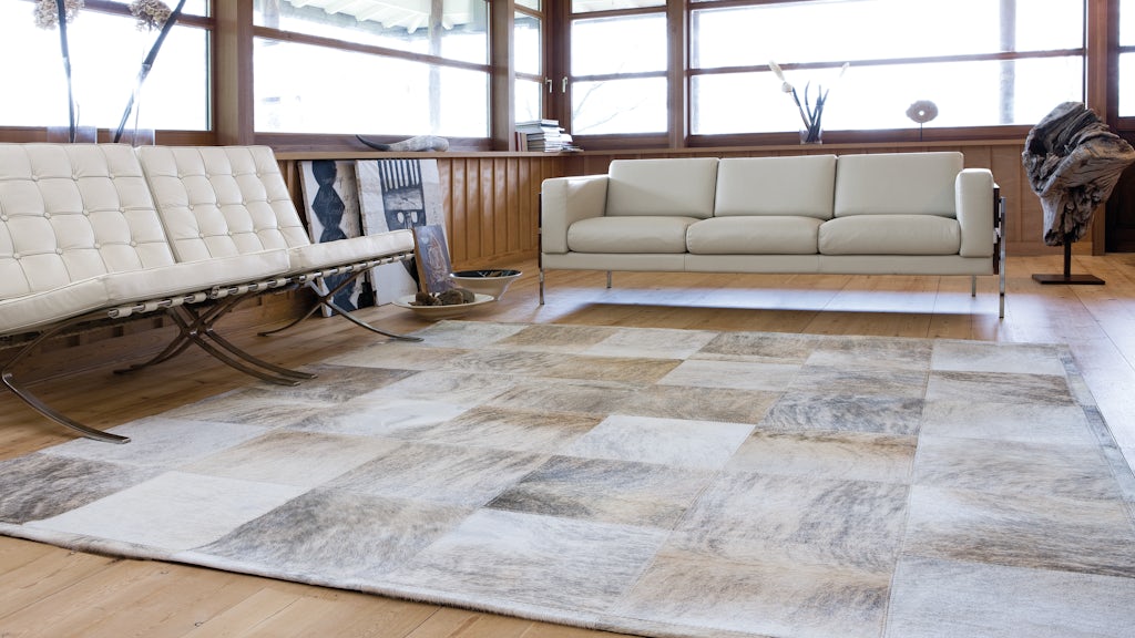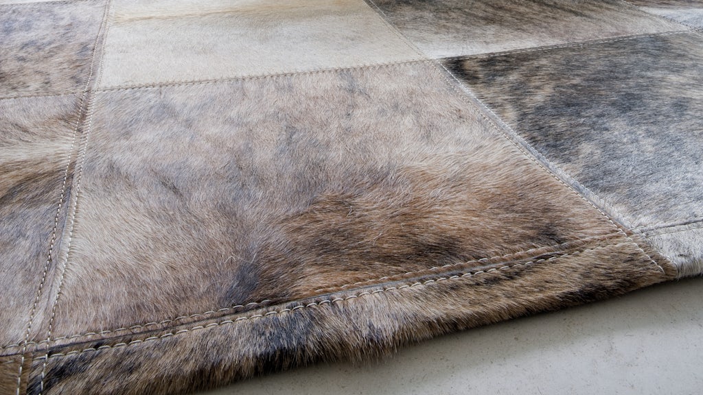 De larges et luxueux carrés de cuir bovin ont été assemblés pour former ce patchwork d’une beauté artisanale naturelle.