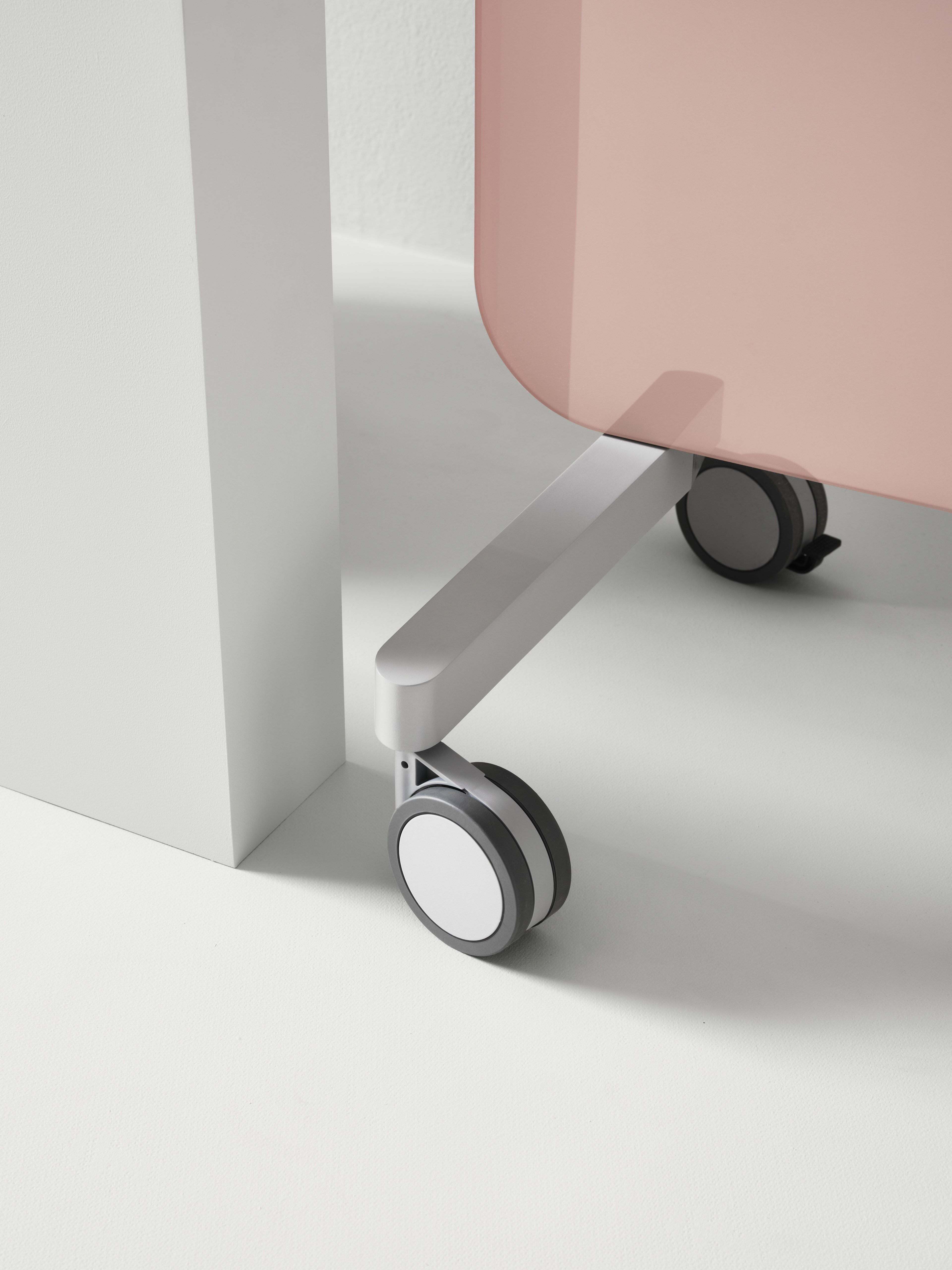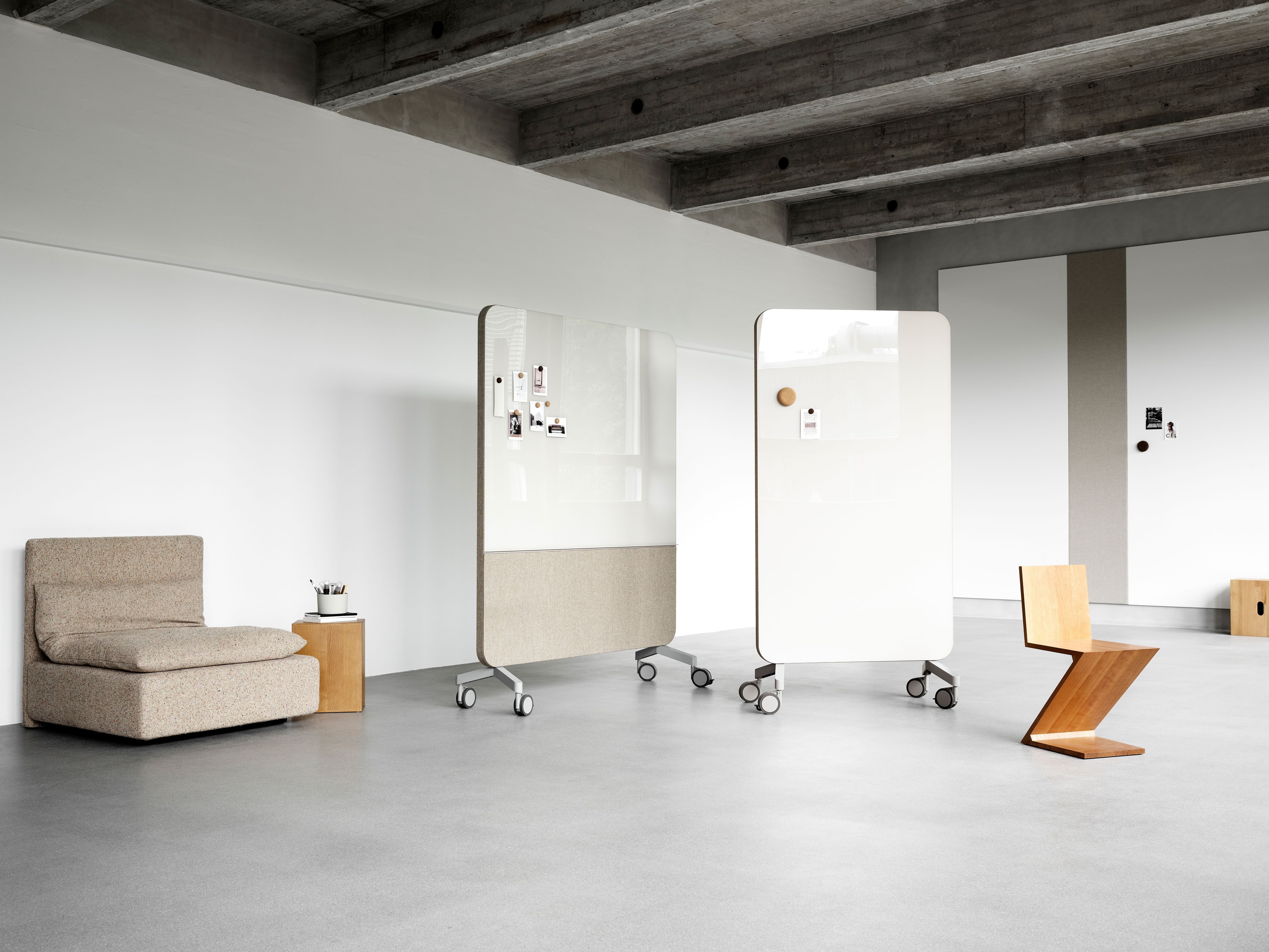 La face arrière de ce tableau mobile en verre est revêtue d’un tissu insonorisant. Il existe un petit modèle avec une face avant entièrement en verre et un modèle plus grand combinant verre et surface insonorisante, tous deux dotés d’un isolant acoustique et d’une face arrière en tissu. Choisissez parmi plusieurs combinaisons de couleurs assorties. Les pieds sont disponibles en noir et en gris avec des roulettes assorties, ainsi qu’en chêne massif avec des roulettes noires. Tous les pieds sont vendus séparément. Conçu par Matti Klenell et Halleroed.