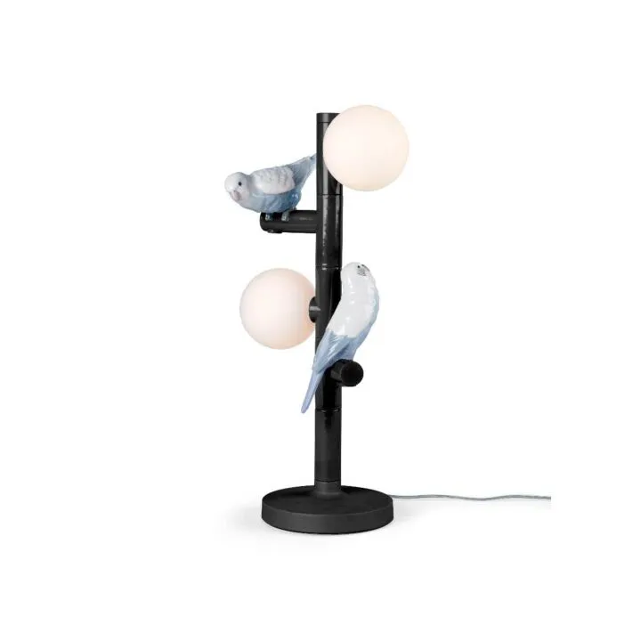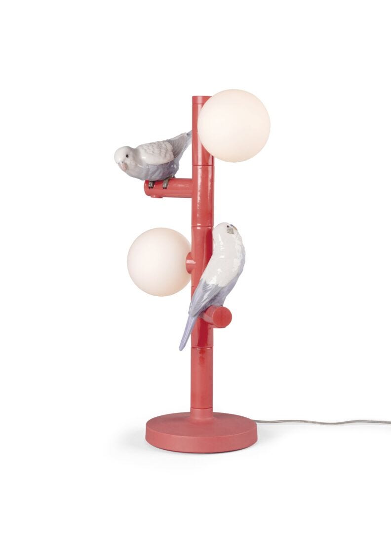 Une lampe de table de la collection Parrot Party, un concept d'éclairage amusant basé sur le contraste entre le design géométrique pur des objets fonctionnels et la représentation très réaliste des oiseaux mignons qui les décorent.